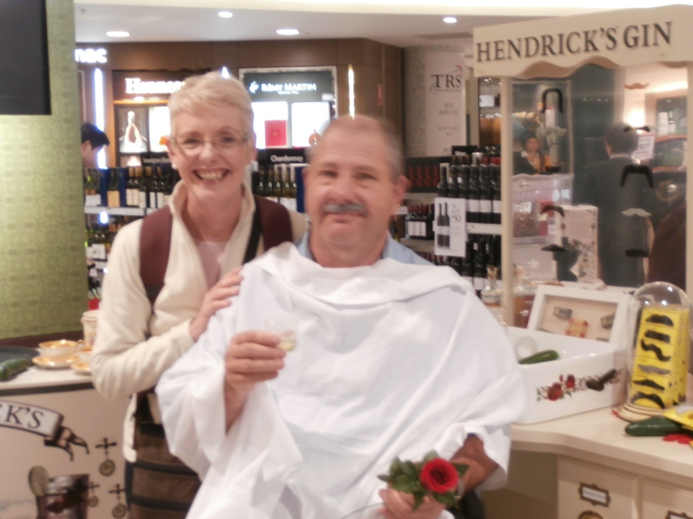 During a walk around the passenger duty free lounge, Michael tried out some gin which involved dressing up a bit. Unfortunately the photo the girl took of us is blurry. Perhaps she had tried a few too many samples!