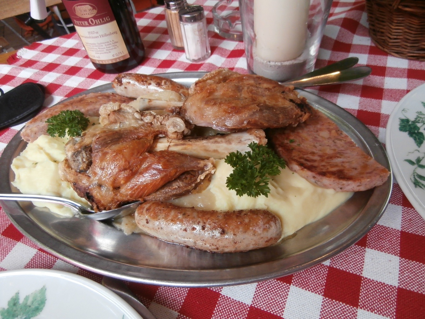 The plate included saumagen ( which is like a meat loaf), roast sausage and a knuckle of pork (each) with sauerkraut and soft mashed potatoes.
