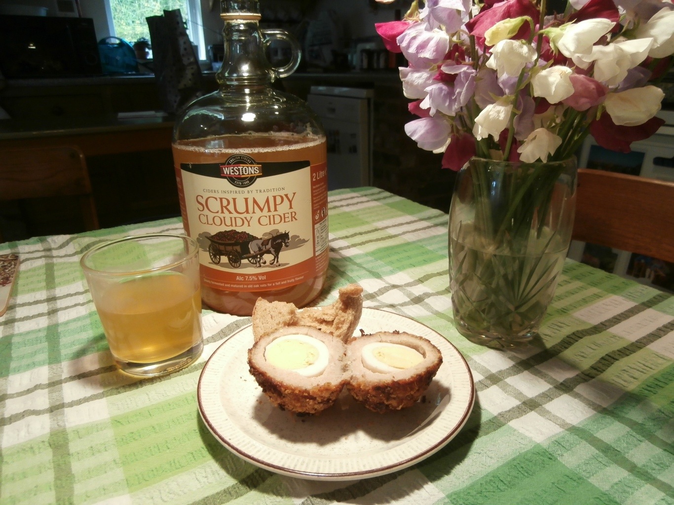 July 15, 2012 janecav Ploughman’s Dinner – scotch egg We bought a scotch egg at the Bridge (hotel) today for £1 and had this for dinner with brown bread, cheese and Scrumpy cider.We were still pretty full from our big lunch. Share this: Click to share on X (Opens in new window) X Click to share on Facebook (Opens in new window) Facebook Like Loading... Related