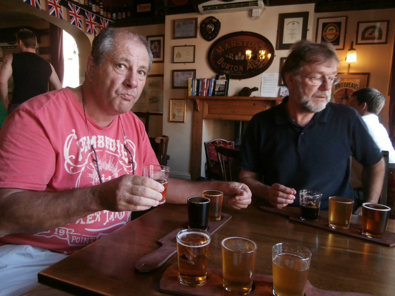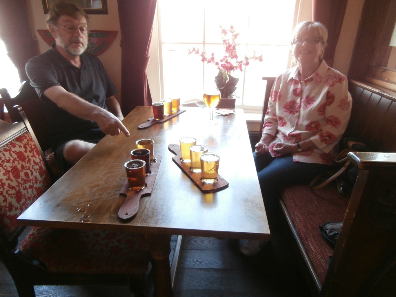 On Wednesday we walked to the Albion and tried the ‘tri sampler’ which consists of three one third pint glasses of different ales. Chris, Michael and me tried these, while Suzanne had a half pint of Leffe.