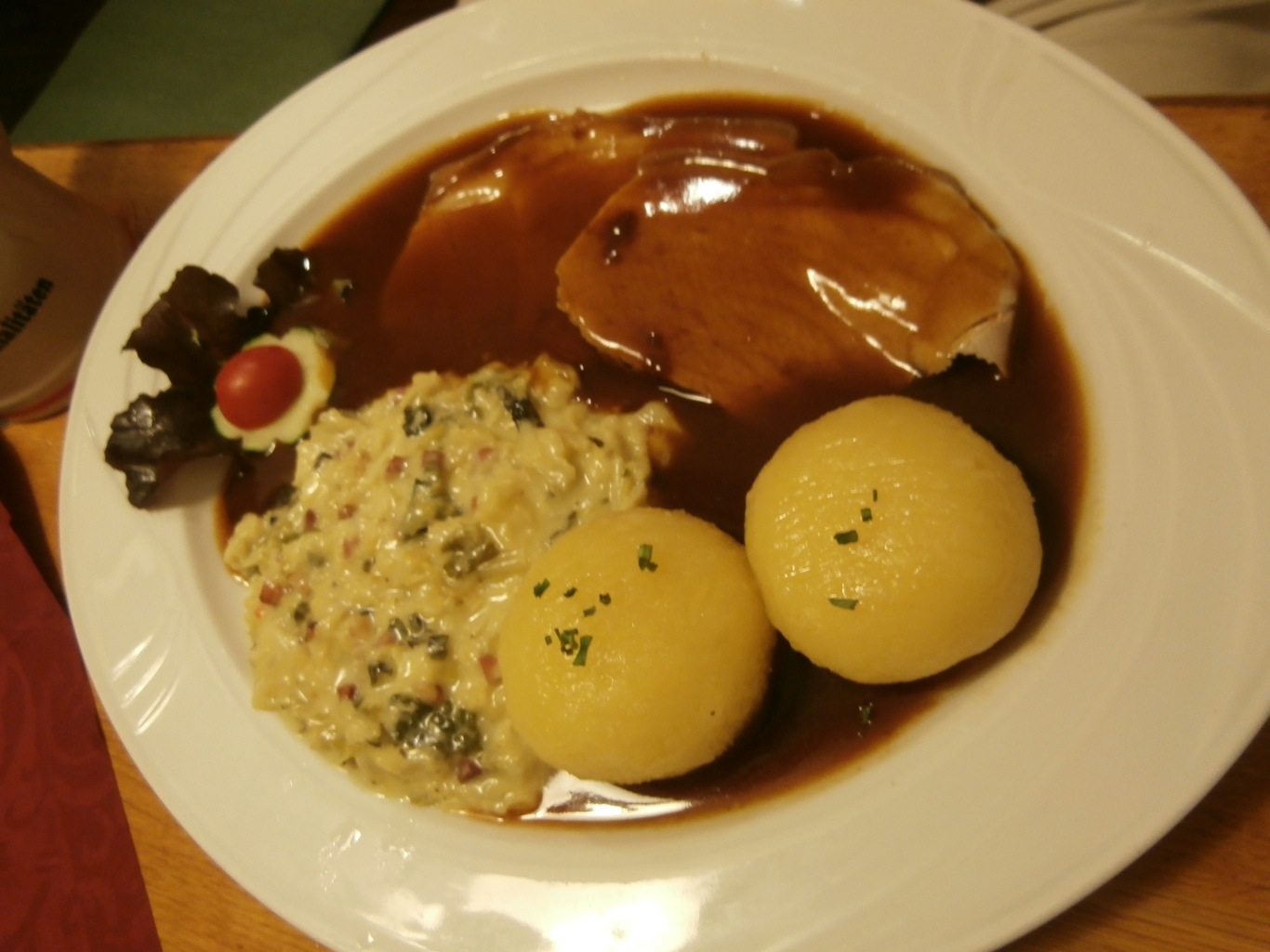 On our first night Michael enjoyed slow roasted pork in beer gravy with potato dumplings and green cabbage In a creamy sauce. He loved it. It came with a local beer for €9.50.