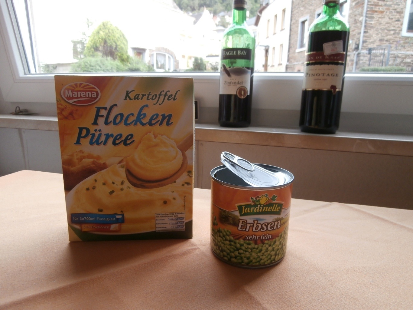 I provided the side dishes of tinned peas and instant potato ( I think ). See photo of the packet of Kartoffen Flocken Püree??? This was because we were unable to buy 2 or 3 potatoes where we were. We would have had to buy 1.5 kg.