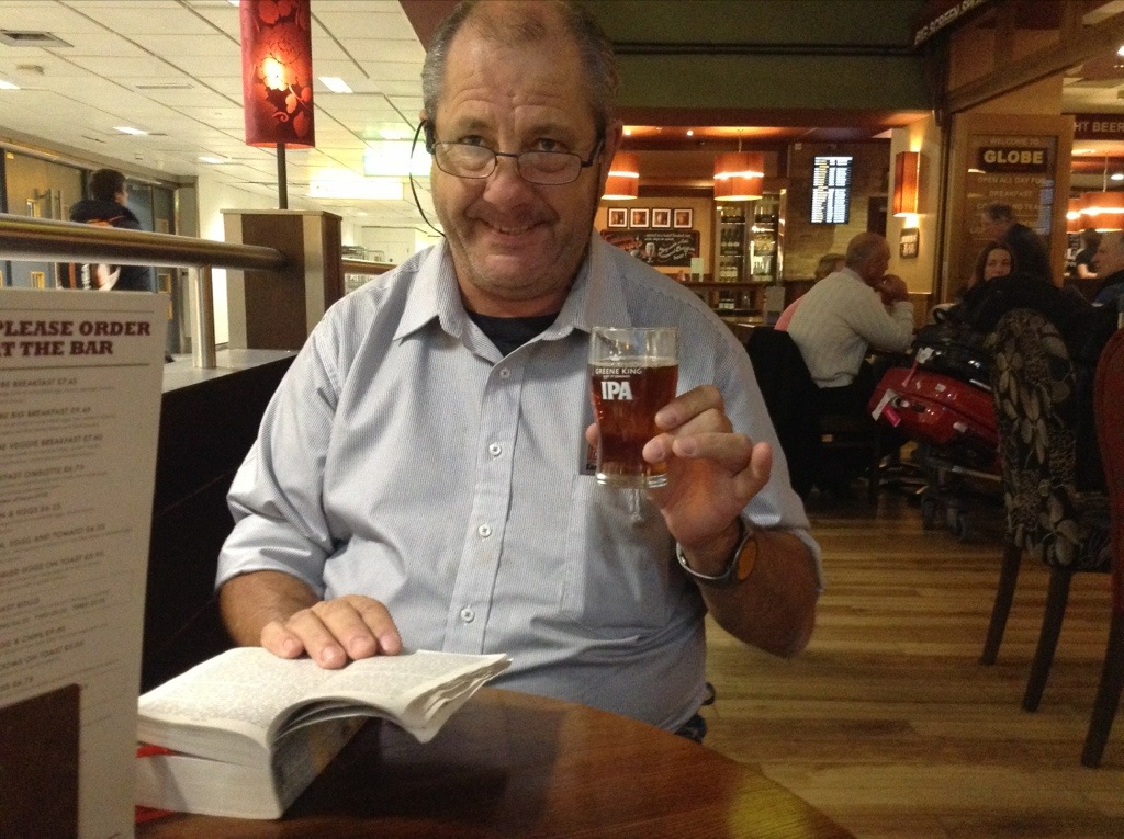 We arrived at 5 am and Air Canada gate opens at 9am, so to kill some time, we went to the “free house” and Michael tried a local ale – Greene King. He did not like it that much, but thought someone had to do it for ” Queen and Country”!
