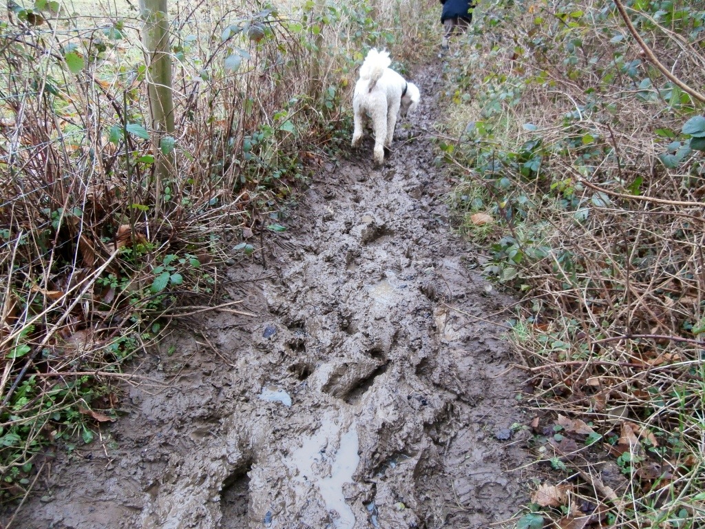 The track became progressively muddy as we had to share a bridle path – a pathway for both horses and people and their dogs. The horses had chopped up the track pretty badly.