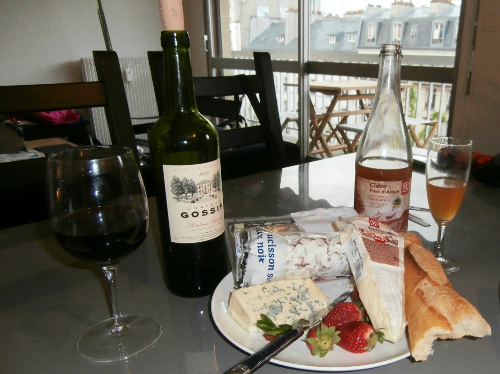 After having a two course meal at the Eiffel Tower and trying to get our body clocks set to French times, we chose some beautiful cheese, pâté, salami and baguette for an early dinner accompanied by some French Bordeaux and Apple cider. Delicious and cheap!