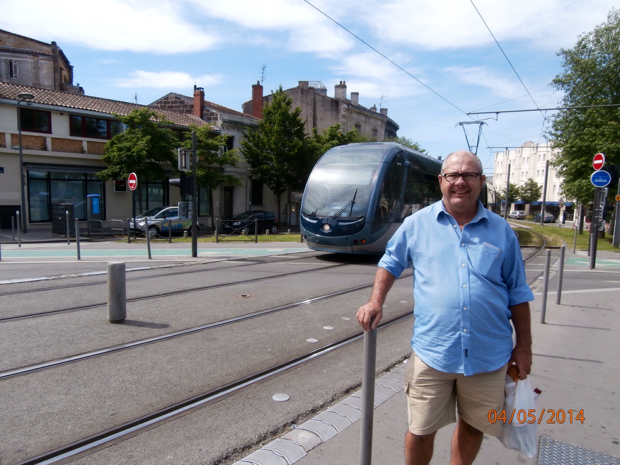This city has brilliant transport – this is one of the city trams wizzing past Michael on our way back to our hotel with a bottle of Bordeaux for us to try.