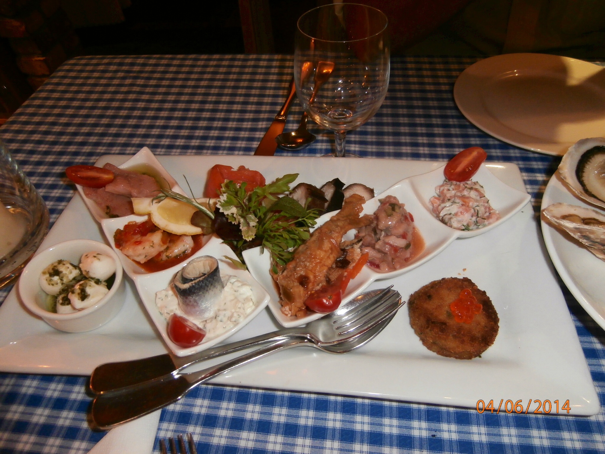 Michael had the Baltic herrings which were served cold (which was a bit of a surprise for him) drizzled with some Goldwasser – which is the vodka of Gdansk and has suspended flakes of 22-23 carat gold in it. He thought they were delicious. While I chose a cheese soup. We then ordered a tapas platter recommended by the chef which included different types of fish mostly served raw.