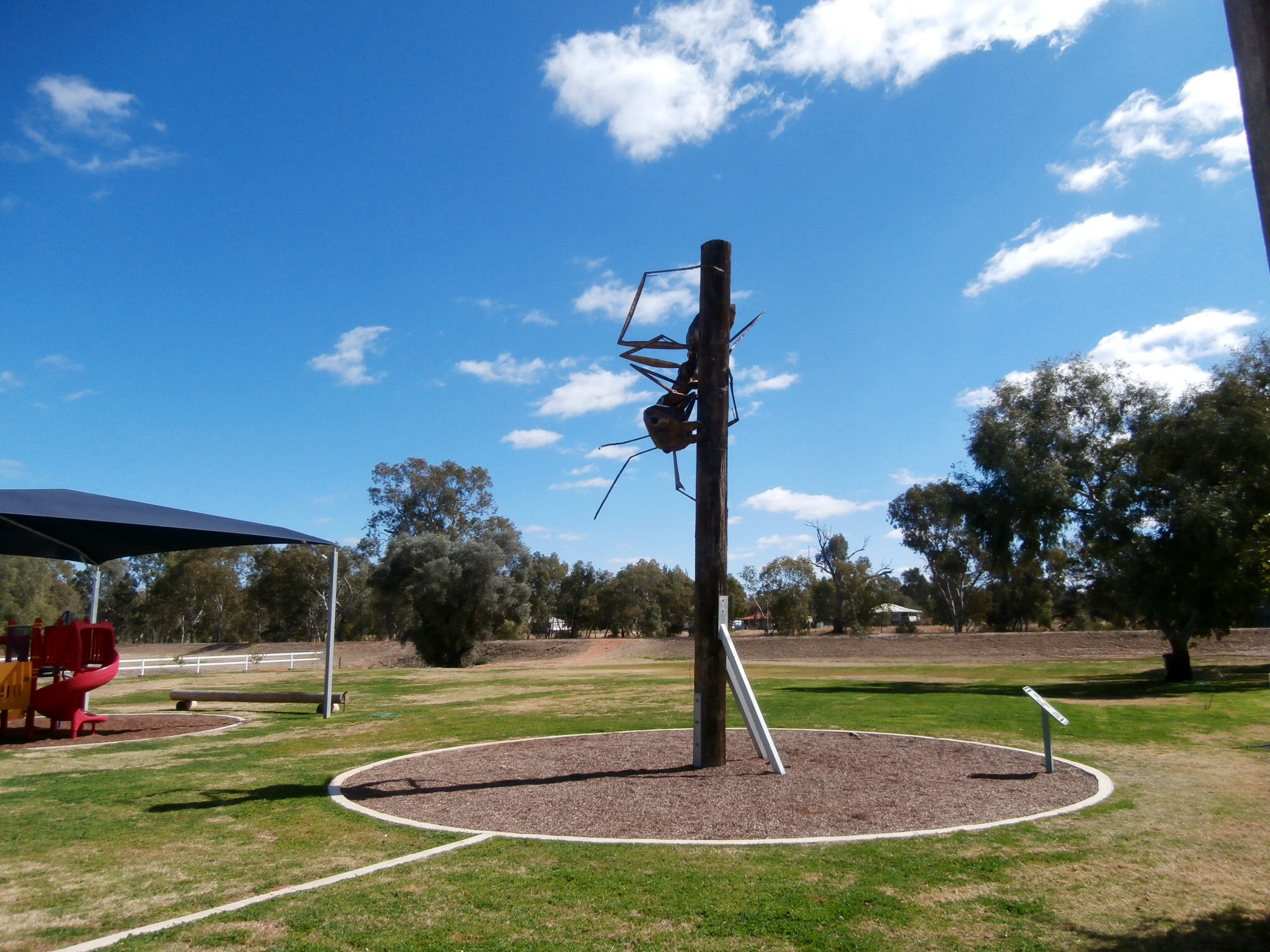 So we headed off around 8.30 am passing through Tambo before stopping for morning tea in Augathella. This little town of 430 people is famous for its colourful past with bushrangers and bullockies. It also has a famous sculpture of a meat ant.