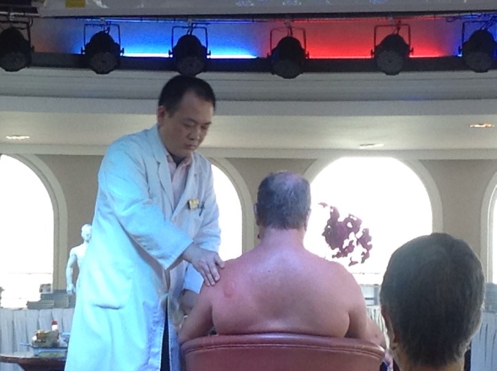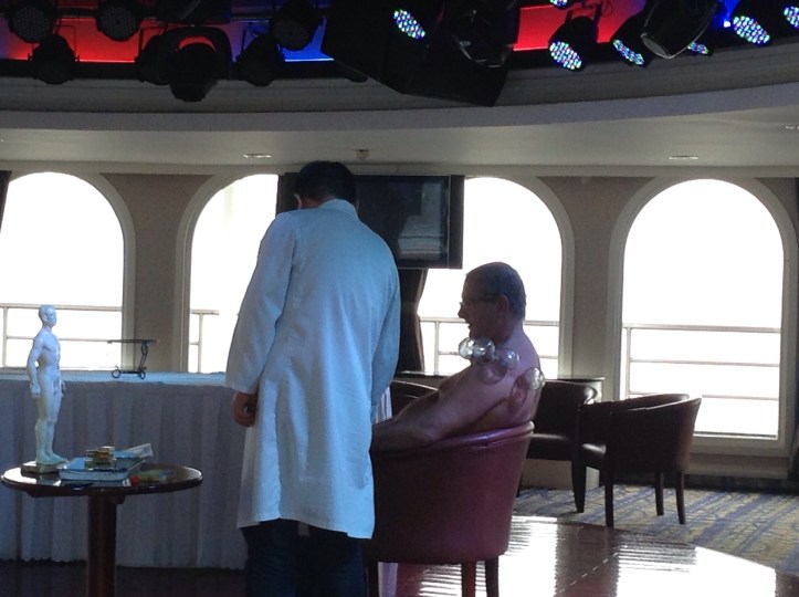 There was a talk by the doctor (Dr Xu) on board about traditional Chinese medicine and acupuncture after lunch. Mick was selected as the guinea pig and happily stripped down to his jeans so the doctor could work on his frozen shoulder while the rest of the passengers watched on. He ended up with a few spectacular bruises where the doctor had demonstrated “cupping”, but was impressed that his shoulder had freed up considerably. He found out later that the service would have cost him about $120US.