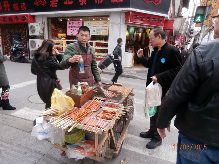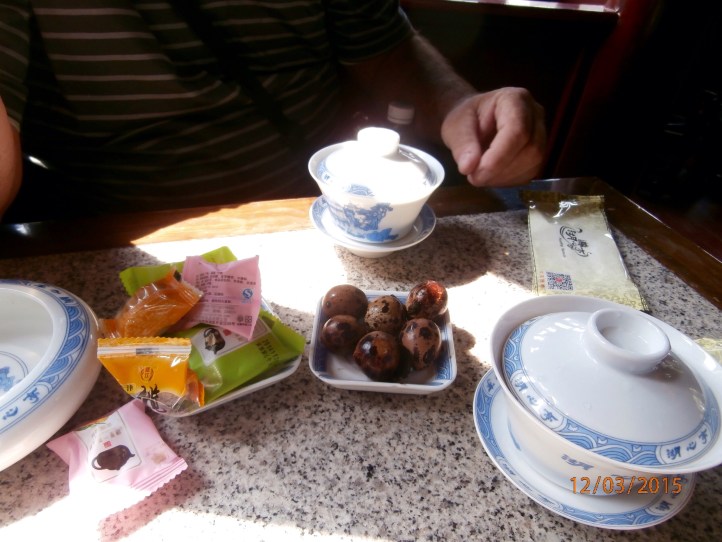 We found a Tea House near to our hotel we had spotted yesterday and ordered a Green Tea set. It was quite expensive- 138RMB each or approx. $29. We did enjoy it though. The pickled quail eggs were delicious and the packets of treats had us guessing as to what they were.