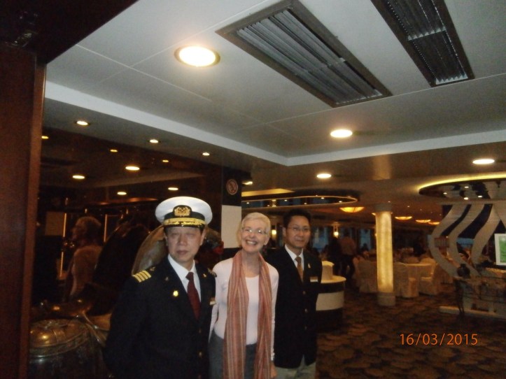 The final dinner on the cruise was held tonight. The Captain came to toast us farewell. I had my photo snapped with him and the tour guide Andy.