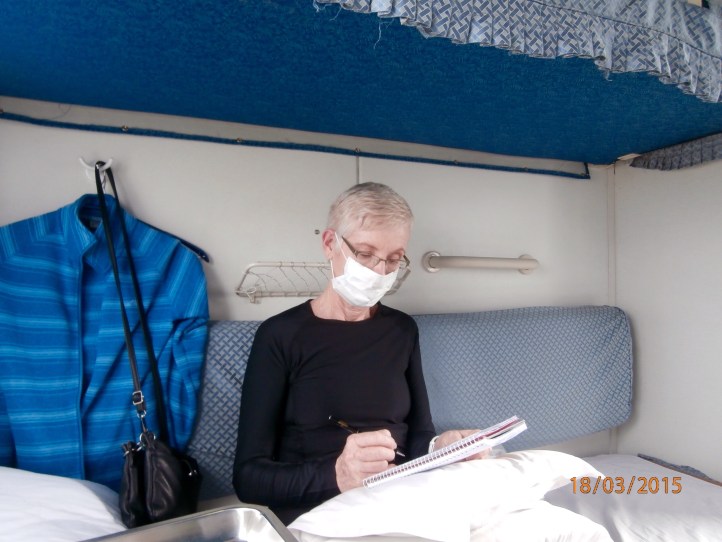 The only thing written in English were the numbers and we knew our train number, carriage and seat numbers. People were lining up at least an hour before departure. The signs indicated we should go through gates 2 and 3. Once the gates were opened, people started to run. At this stage we knew not where to and we thought we had plenty of time, so no hurry. We started to line up for gate 2 and after a few minutes of pushing we noticed the gate was changed to 5. We pushed our way across as we saw the exit gates on 2 and 3 were locked. I was pushier than Mick and got quite a bit ahead of him, but we eventually both made it through and found our carriage and berth. We were sharing it with two young men. The floor was wet and the seats / bed made up. Hot water is available in the carriage and there is one WC for us to share. I decided not to drink on this trip as we will be on this for ten hours. See if you can spot Mick with his hand up in this photo.