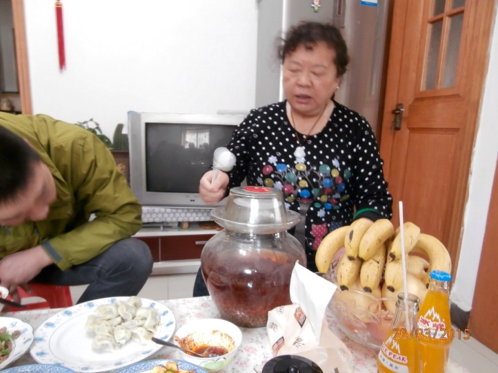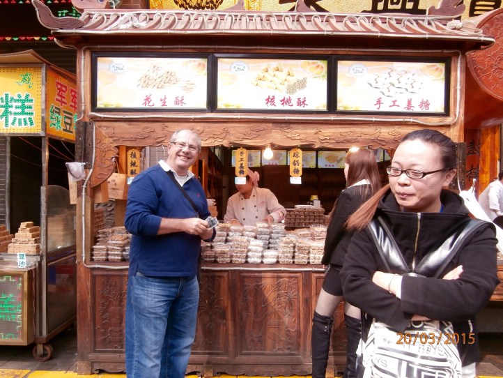 The food was fantastic and we did buy some of the foods, but not to eat then as our next stop was lunch with a local family, a couple the same age as us who were both retired from working in the hospitality industry. In China the females keep their family name when they marry, so it was Miss Ho and Mr Chow. I was a bit sceptical when we passed through a boom gate and drive through a series of buildings that looked in pretty bad shape, before pulling up in front of one of them to be told this was where we were having lunch. I was pleasantly surprised when we walked inside the two bedroom apartment where this couple had lived for 35 years to be seated in their lobby (dining/lounge room). Miss Ho proceeded to bring us out later of food she had prepared for us. Some of the food we had not eaten before and it was very nice. She offered us some of her homemade white wine, made from alcohol she purchased at a store and then mixed with persimmon seeds and Chinese herbs for 3 months. It was really tasty. Through Irene as interpreter she told us it was about 40% – “not too strong”! Mick had shown too much enjoyment of one of the snack biscuits on offer and Miss Ho insisted that he take five packets of them with him. She could not be dissuaded.