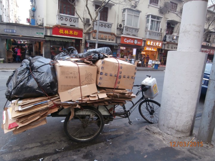 In Shanghai the majority of bikes had been modified to electric engines. This made them totally silent and therefore a bit of a hazard to us as pedestrians. We noticed that the bikes do not take notice of the traffic lights. The first few times we crossed the road we were nearly knocked over because we never thought for one minute that we needed to keep our eye out for a noiseless “clutch” (my made-up term for more than one bike) of motor/electric bikes carrying multiple numbers of people and/or loaded with huge cargos. Mick started to hold his arms out whenever he crossed the road, confident he could stop a bike before it knocked one of us over. Thankfully his theory was not tested.