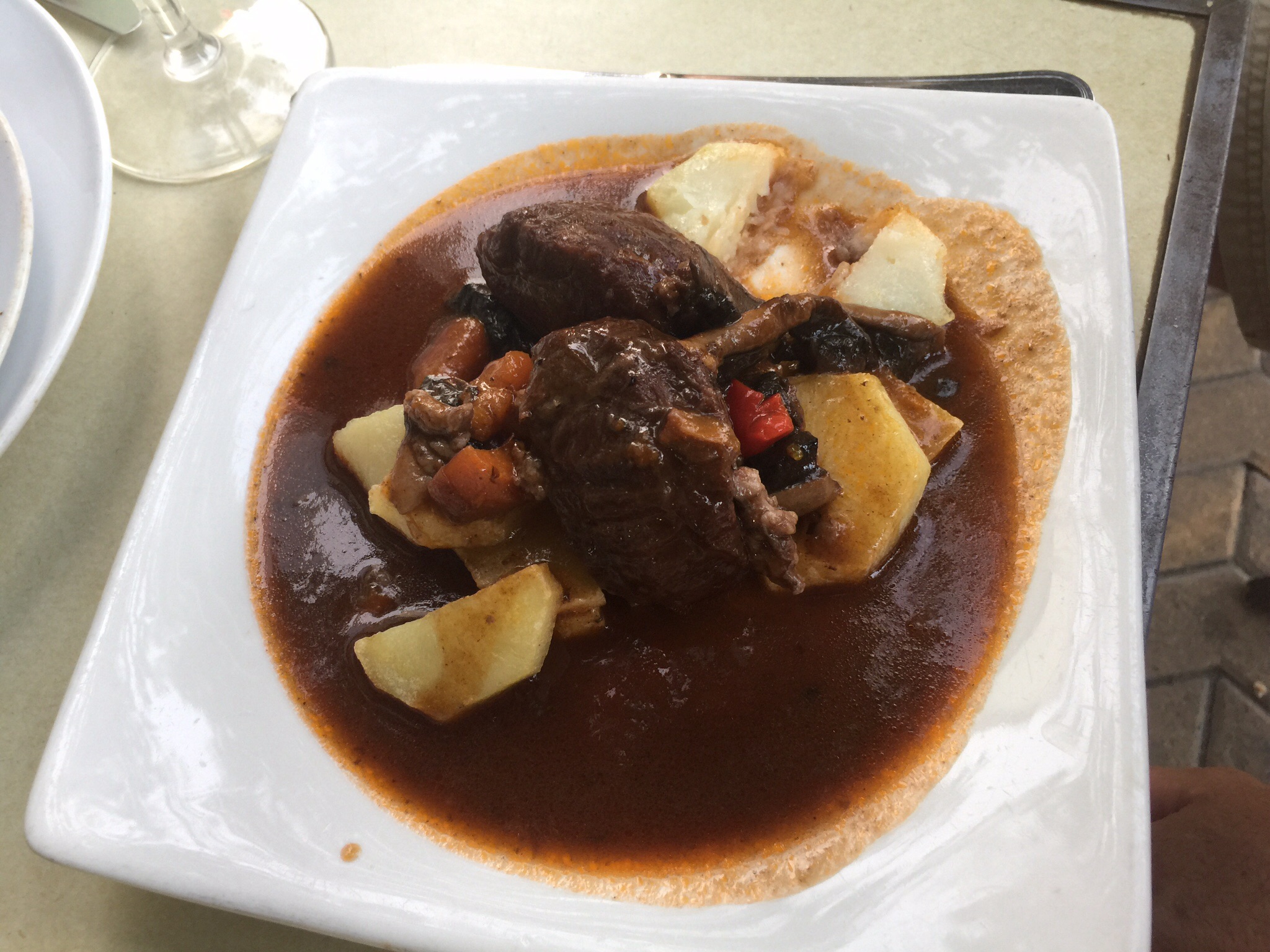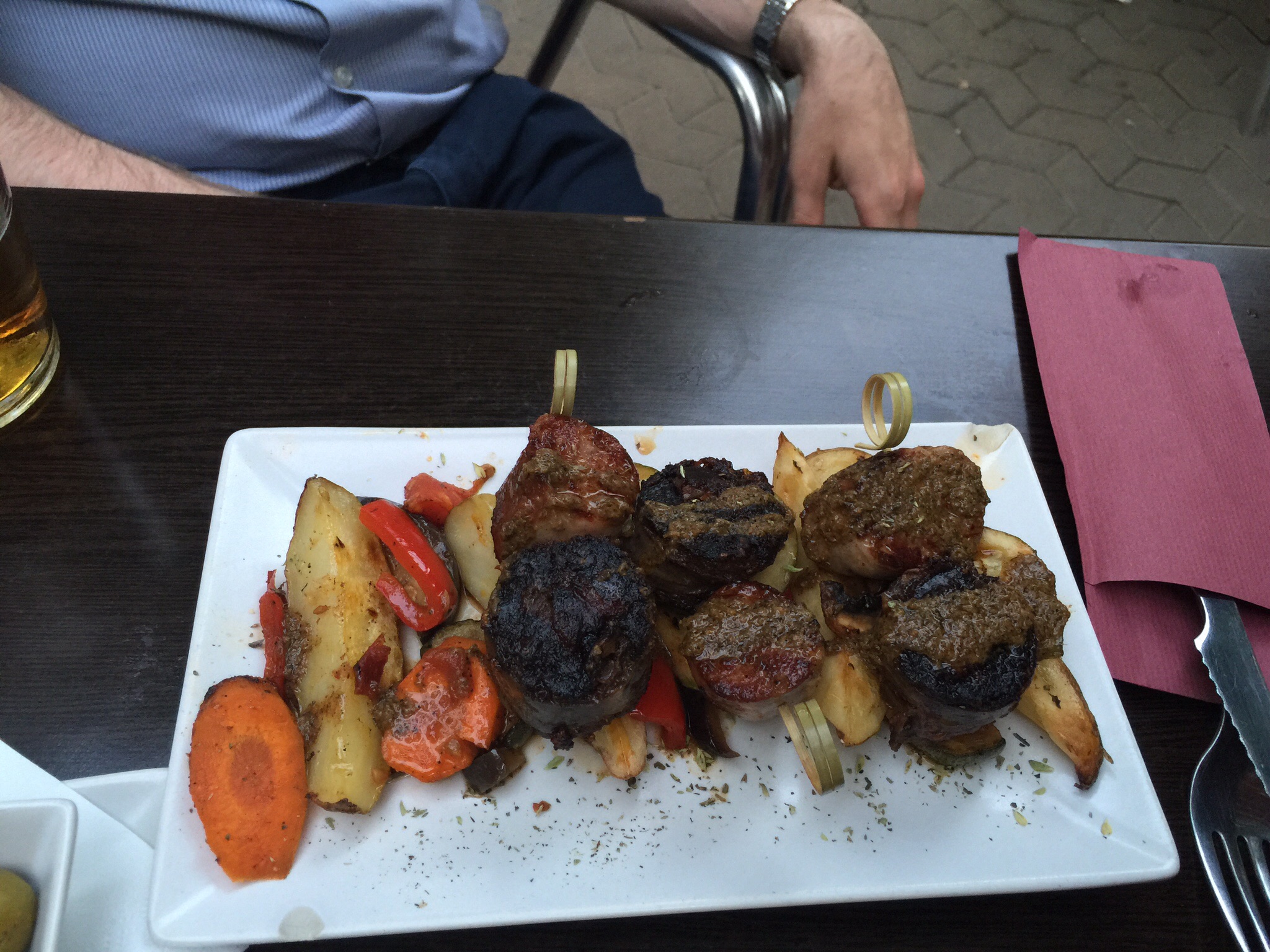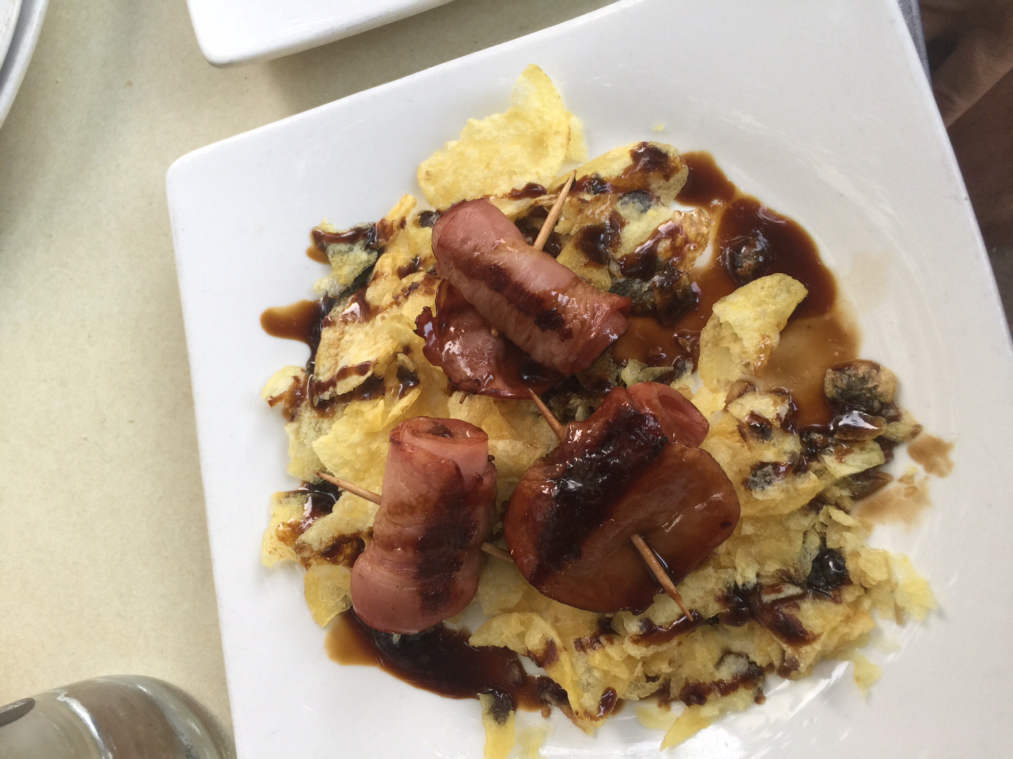 Our hostess had suggested we try the local speciality here of dates with bacon. It was delicious. Mick tried the pork cheeks, for his first time. And he loved them.