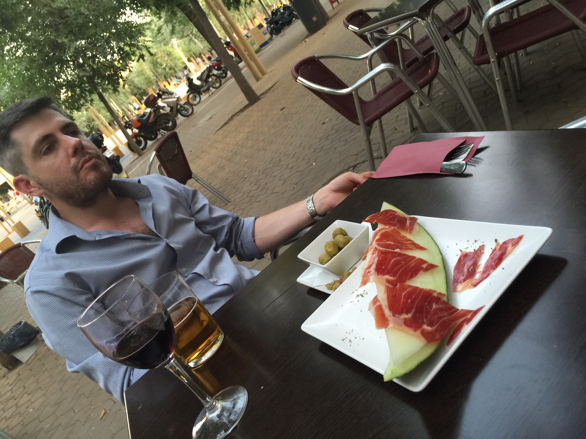 This place is famous for its meat dishes. We selected the chorizo and blood sausage plate and melon with Iberian ham (which was my favourite).