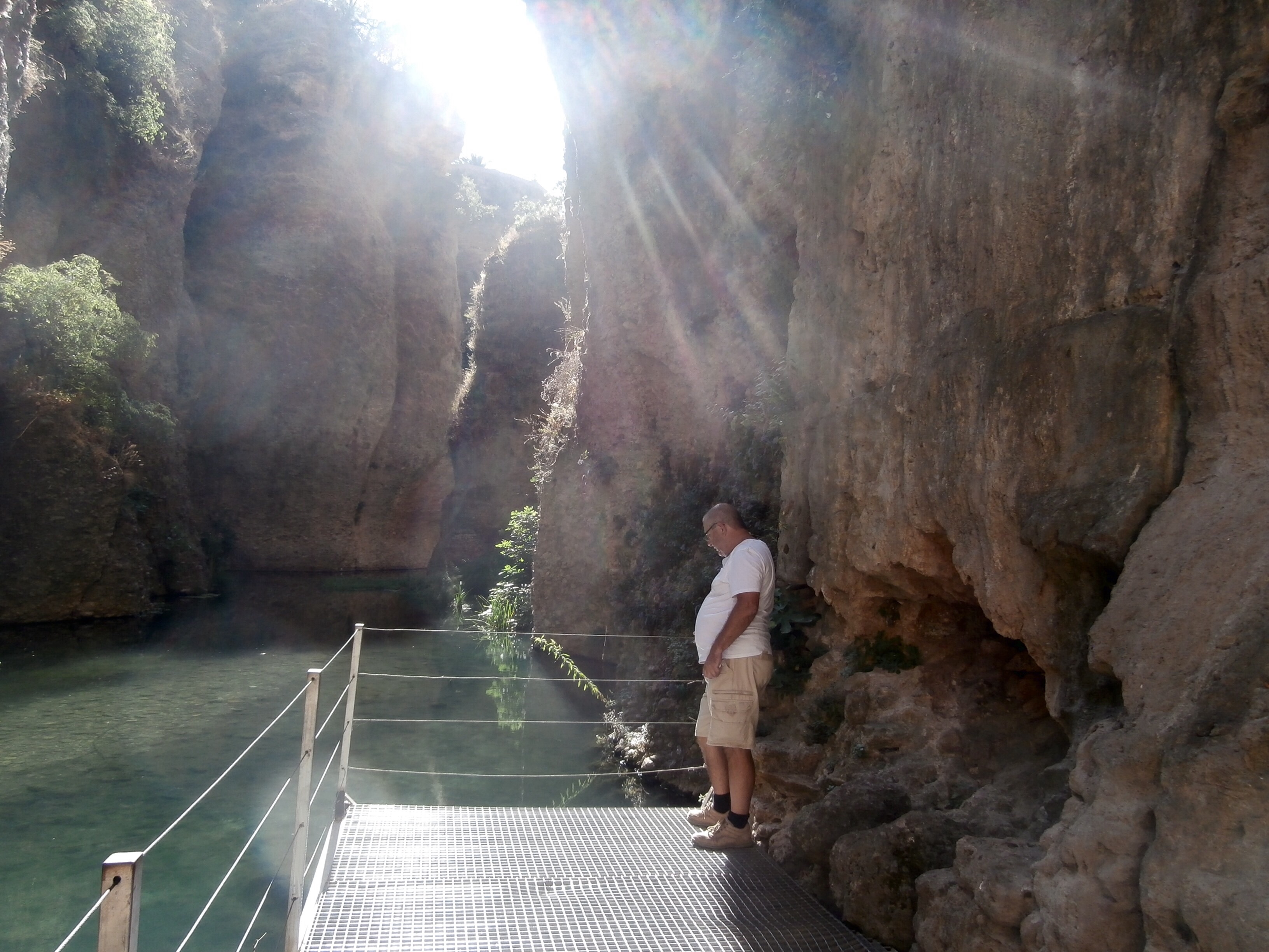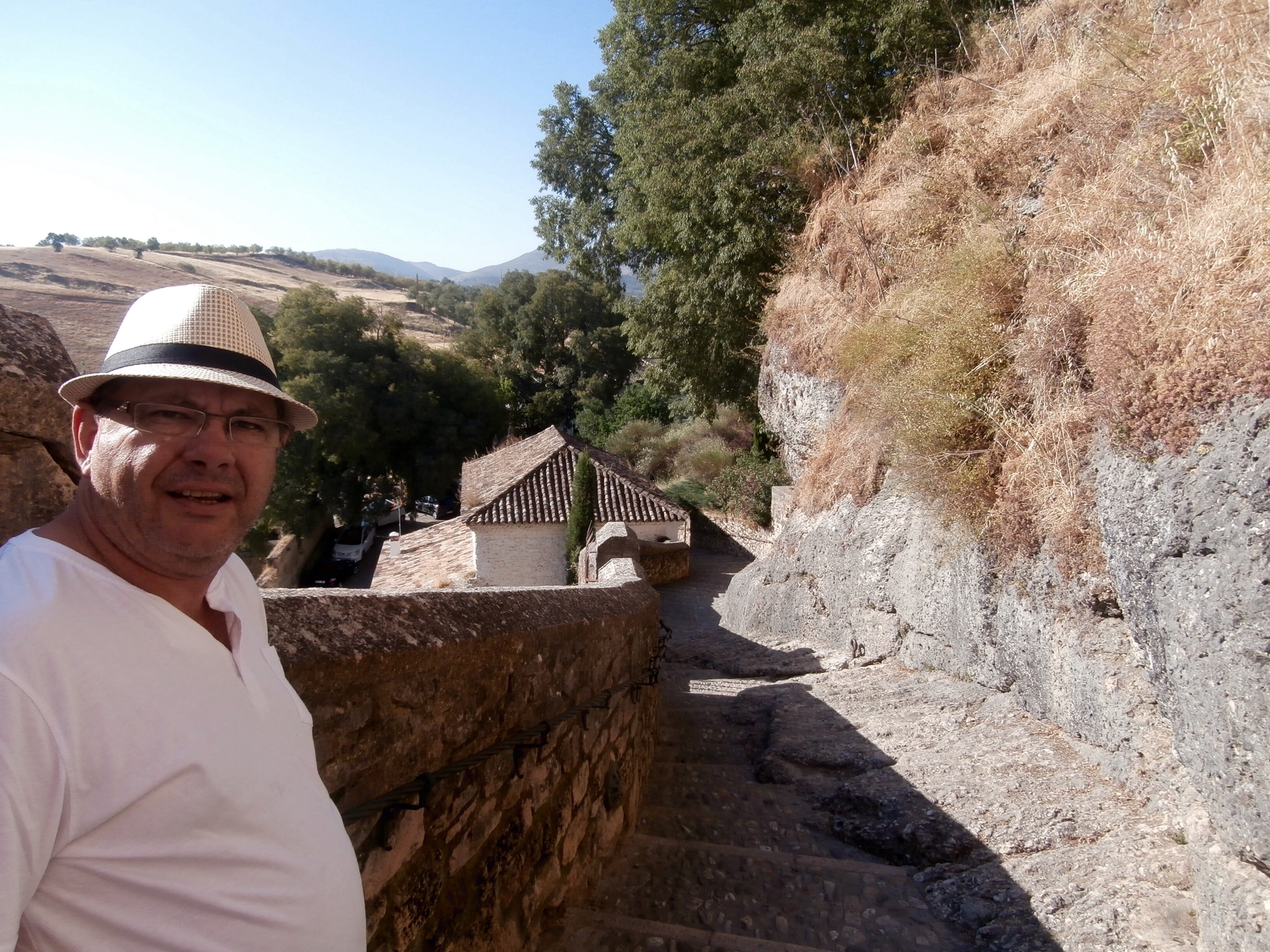 We headed off this morning in search of the Water Mine – we wanted to also visit the Arab Baths but thought we’d need a separate time for that. These two places we knew were near to each other, but I could NOT work out how to get to them. And, the signs in Ronda did not help at all. We walked to the old part of town this morning and Mick was pretty confident he knew where to find the Palacio Del Rey Moro, which was where we could visit the Water Mine. We found a tourist sign (right across from the hotel you are going to stay at Barrie and Robyn) on an intersection to a road Mick was sure would lead us there, but the sign had no mention of these two places. Undeterred, we walked down there to find exactly what we were after.