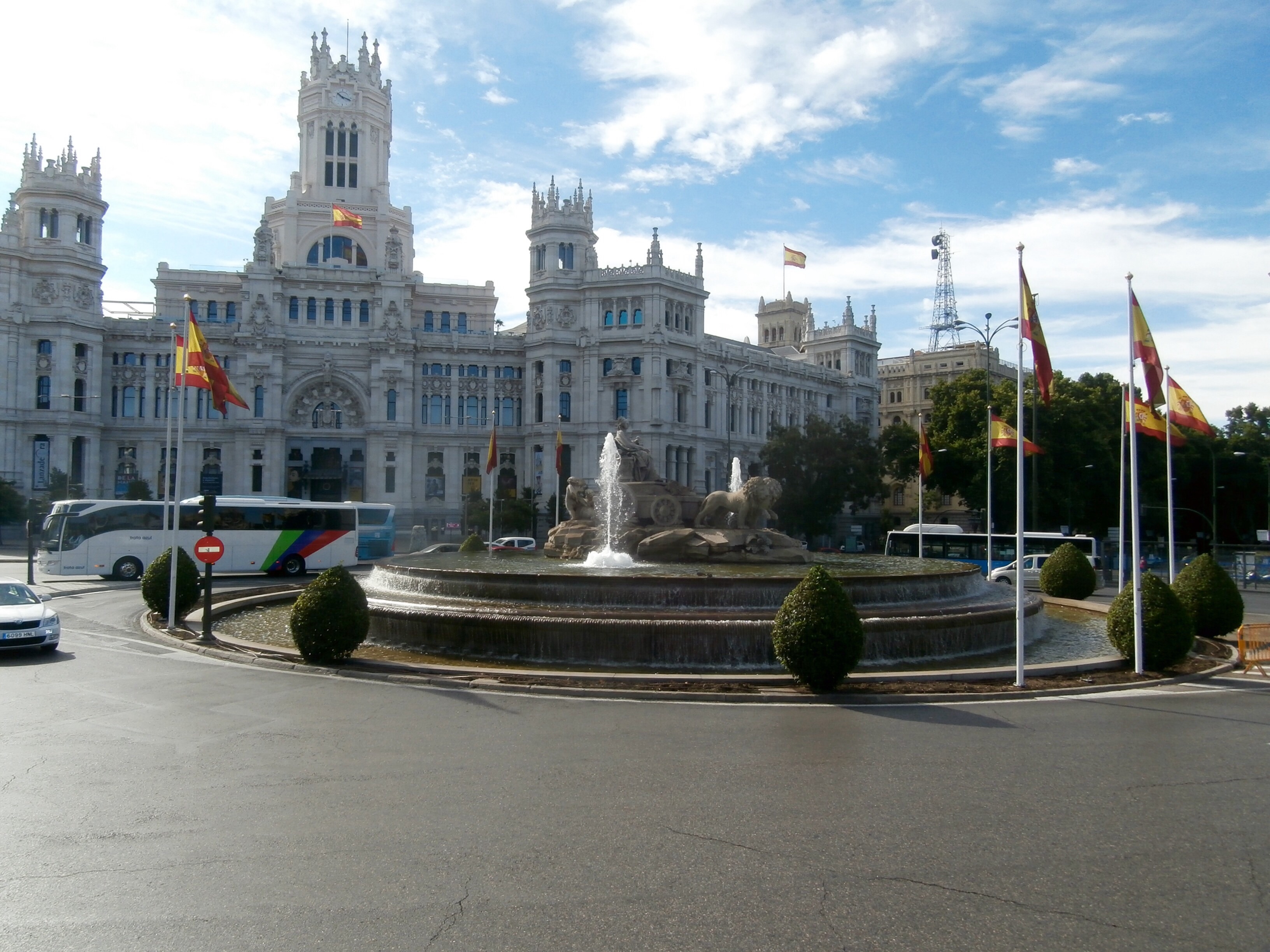 Two in one in this shot (but you may need your magnifying glass) – with the Cibeles (Ceres) Fountain, depicting the roman goddess of nature in a chariot being pulled by two lions. This fountain was built in 1777 and is famous for being the meeting place of fans of the (soccer) team Madrid Real if they win a cup.