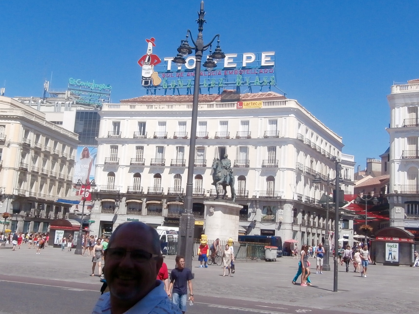 This photo of Mick was taken in front of the Puerto del Sol. This square marks the epicentre of the city and it is from here that all distances in Spain are measured. The statue in the middle is of King Carlos III (“M” is for MONARCHS). I wanted this photo to show the famous sign of Tio Pepe sherry in the back for Mick’s mum Kath, who had told us about it before we left. This sign has the same importance as the Coca Cola one in Kings Cross.