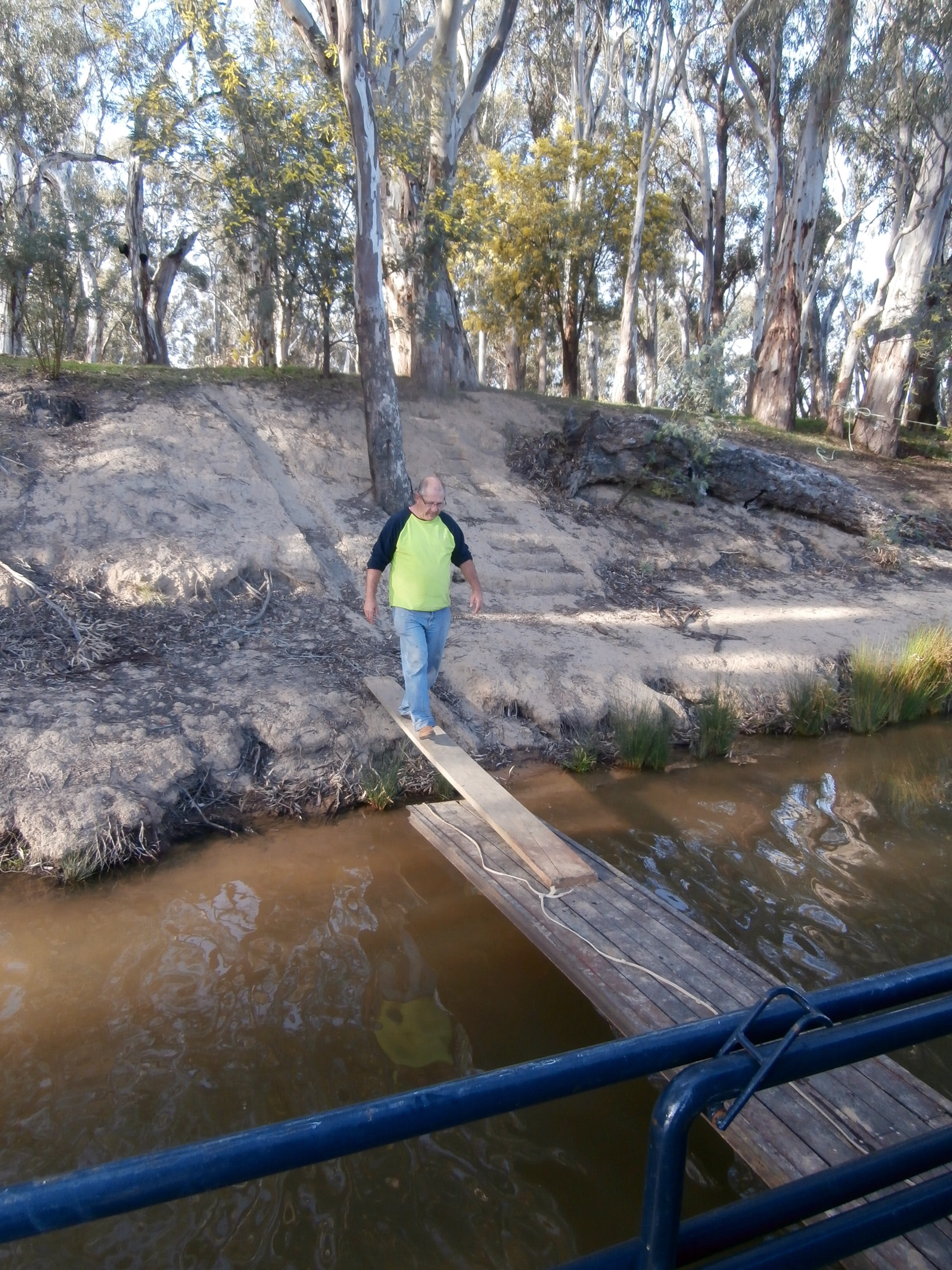Unfortunately the first spot was too shallow and the second spot had no suitable trees close enough to tie us off against but we were luckier on the third attempt. The only problem was that the boat could not get too close to the bank and the built-in gang plank had to be lengthened by adding another narrower plank. Helen was not game to try it and I certainly didn’t use it after I’d had a drink.