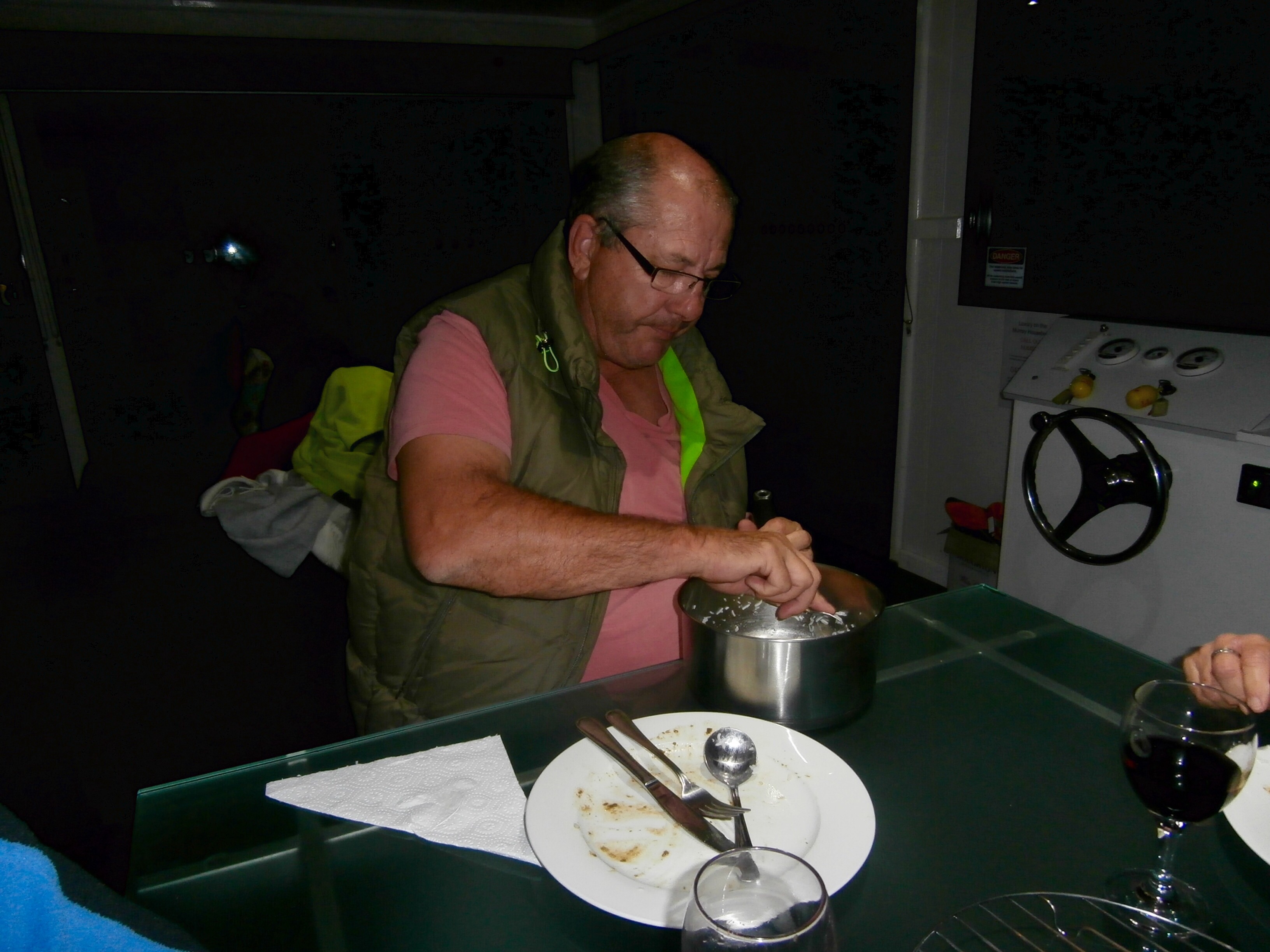 While we waited, Derek got started on preparing dinner as it was his turn. He had chosen a lamb curry and had purchased a shoulder of lamb, planning on dicing it up on the boat. But, the biggest complaint about the boat (other than the fact one motor didn’t work today) is the lack of sharp knives. The ones supplied won’t even cut bread.