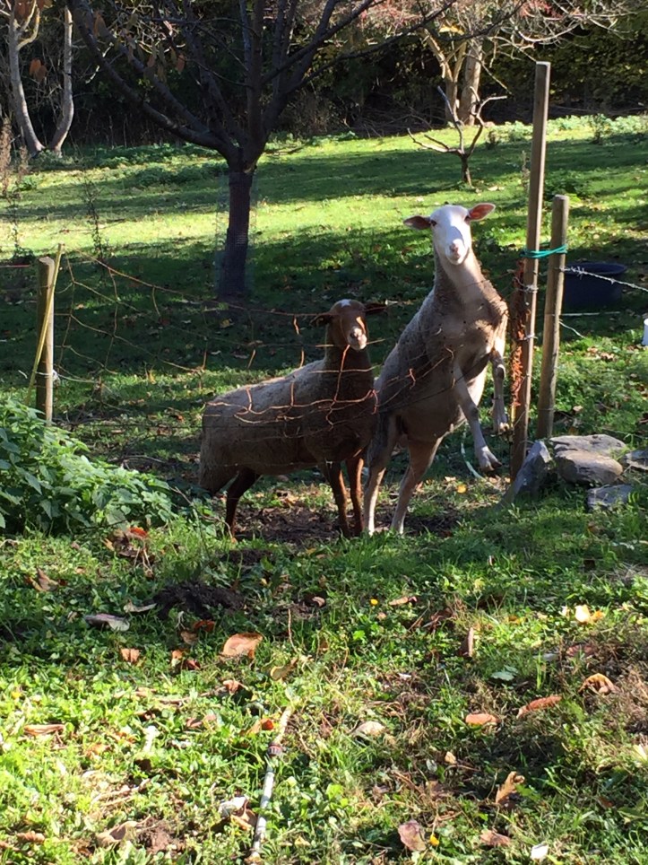 This is why we’re here. These three girls lay one egg each a day and the sheep – Bee Bee and Betty are very tame. We took them for a walk yesterday and I will take some photos of that for another day. They were hoping I was going to let them out when I went and took this photo.