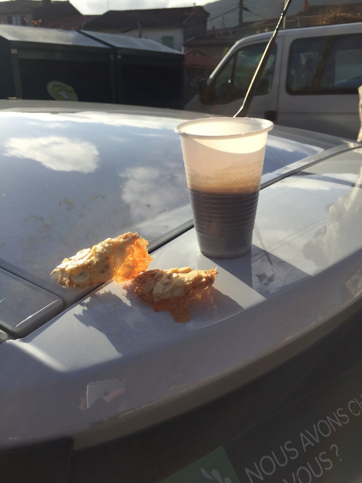 After being disappointed yesterday with our bad luck at not finding a cafe, and me not wanting Mick to complain about it again, we started here – to buy a baguette and a coffee and some of their famous biscuits. We weren’t disappointed but note the take away coffee cups.