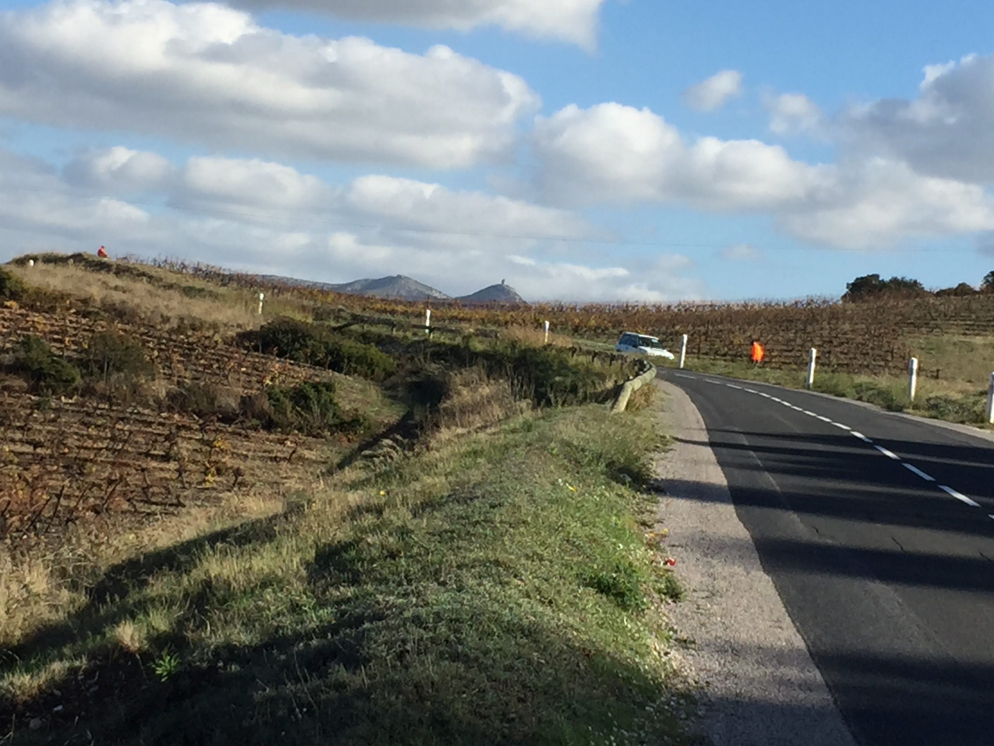 On our drive to and from Tautavel we had noticed the hunters out in force (after all, it is Wednesday). You have to look hard at my photo which shows two of the 6-8 we saw along this stretch of road. Each in his high viz shirt, each facing the same direction, gun at the ready. It reminded me of fishing!
