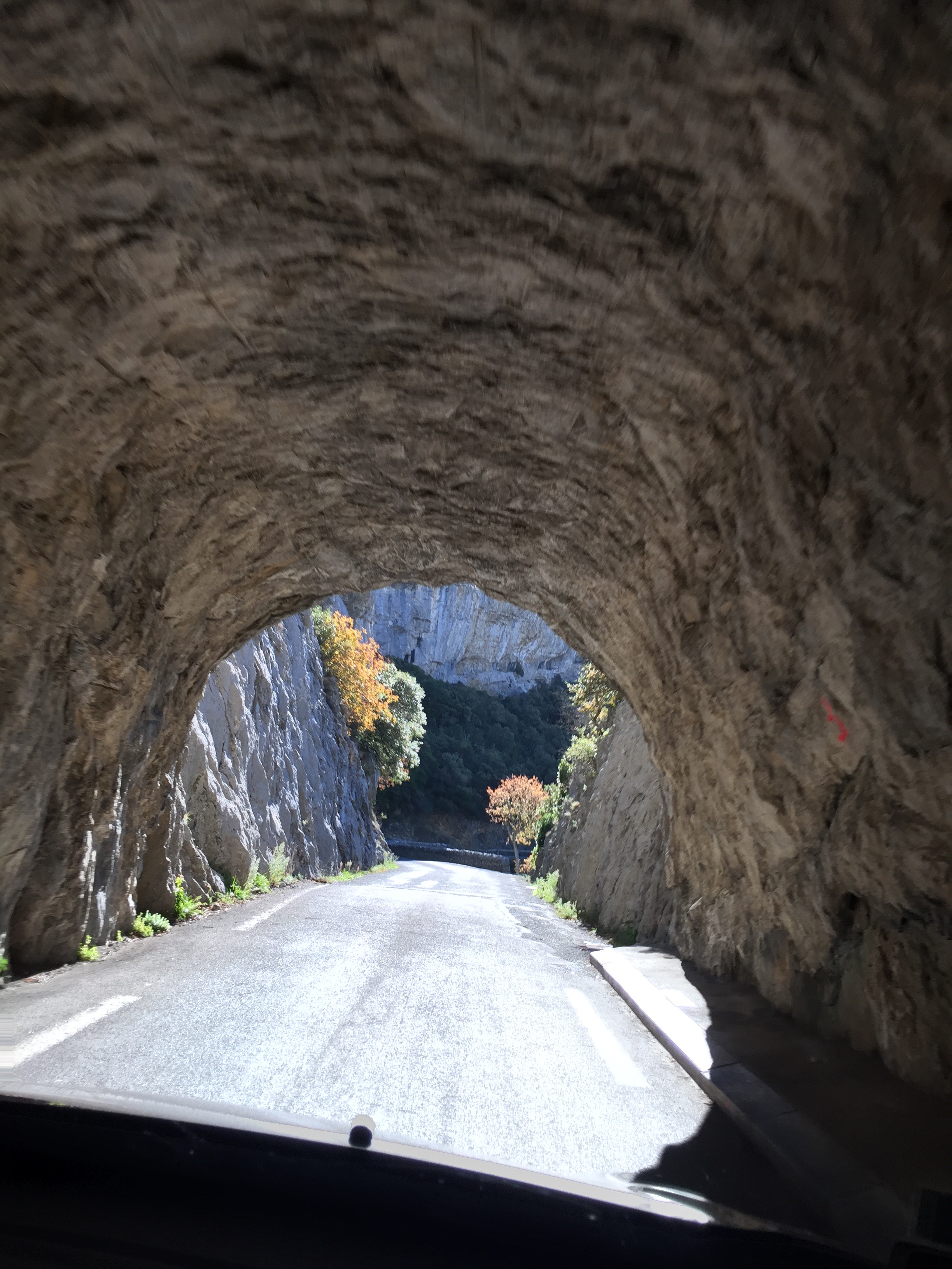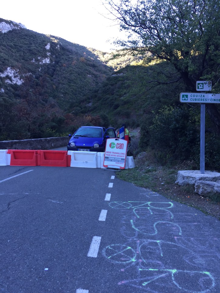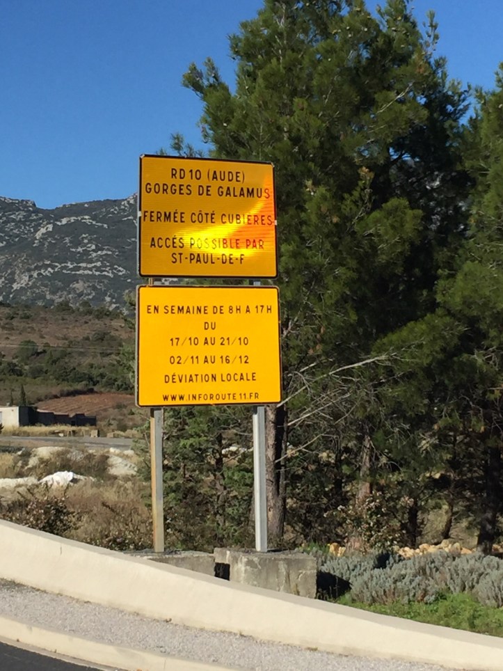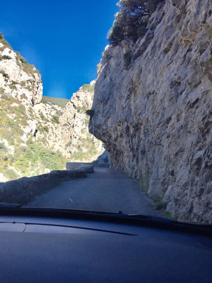 The next part of the journey was through the narrow gorge to a village called Cubières-sur-Cinoble. We had planned on having lunch there. This road is so narrow that in the high season they have traffic lights to guide the traffic safely through – taking turns in each direction.