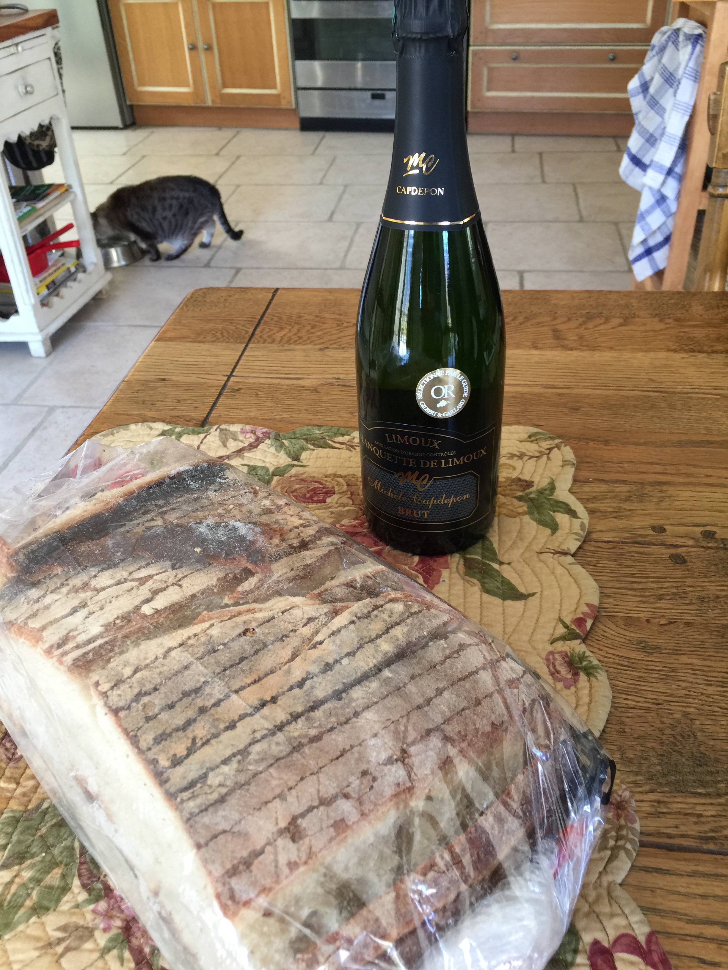 Sadly, the wine maker Mick had met last week was not there today and the Blanquette he tasted at the markets today was just not as good, so we stopped in Quillan and bought a bottle of the very well known brand Blanquette de Limoux. The photo shows our sliced bread as well, and the pussy cat that is not injured.