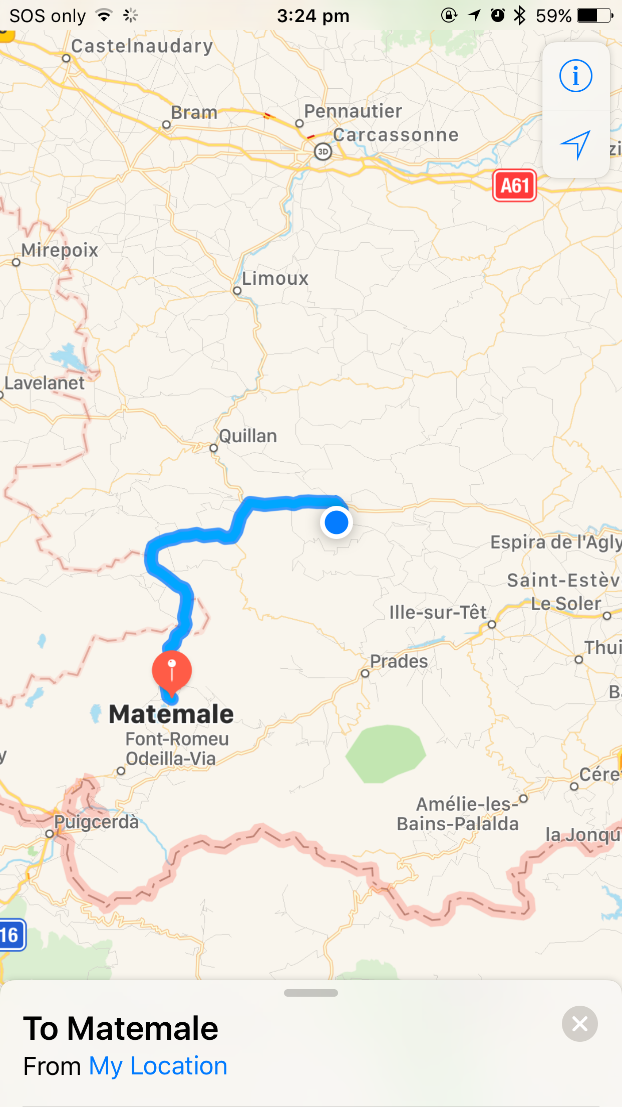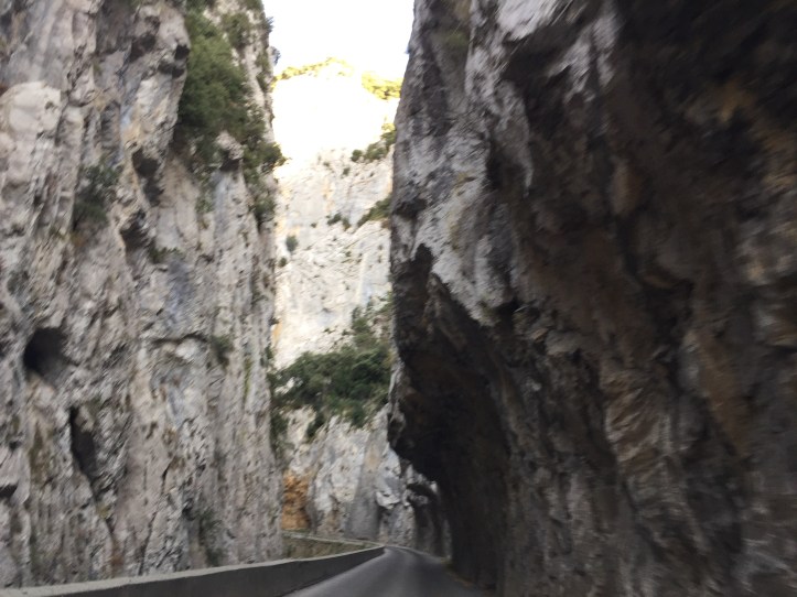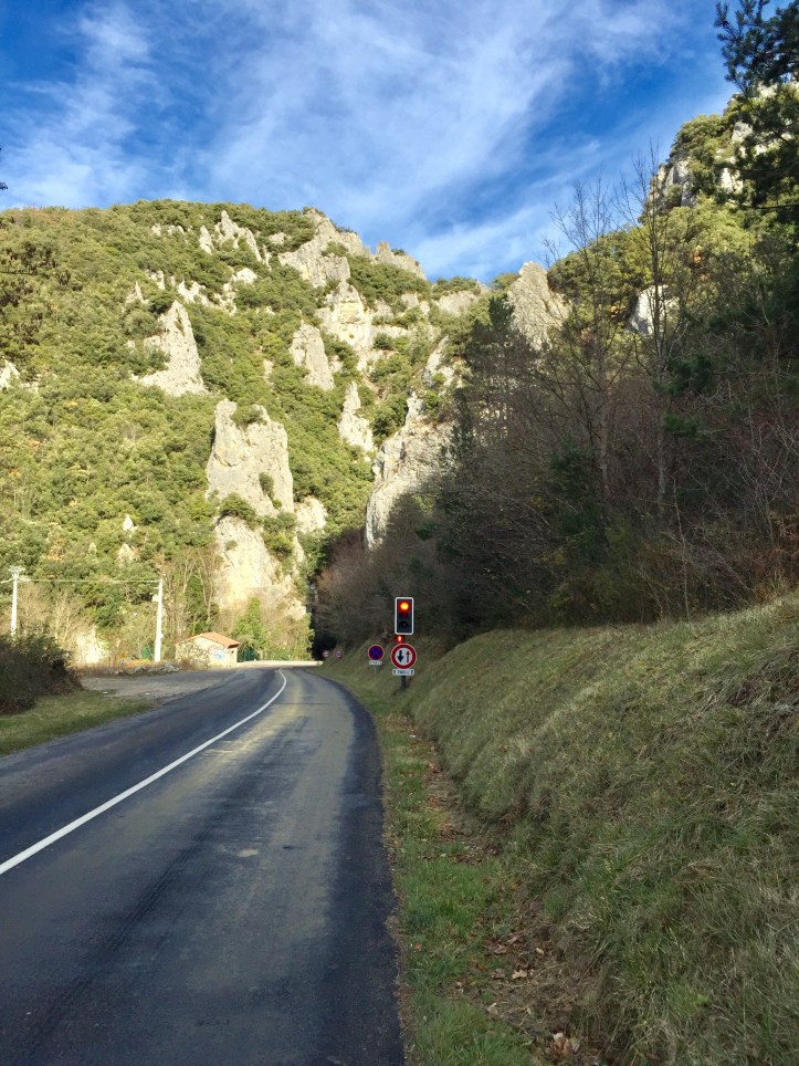 Only 63 Km from here, but pretty much up hill all the way. The road was so narrow in one section just after the village of Axat that traffic lights were used to make the road one way at a time. What a good idea 💡.