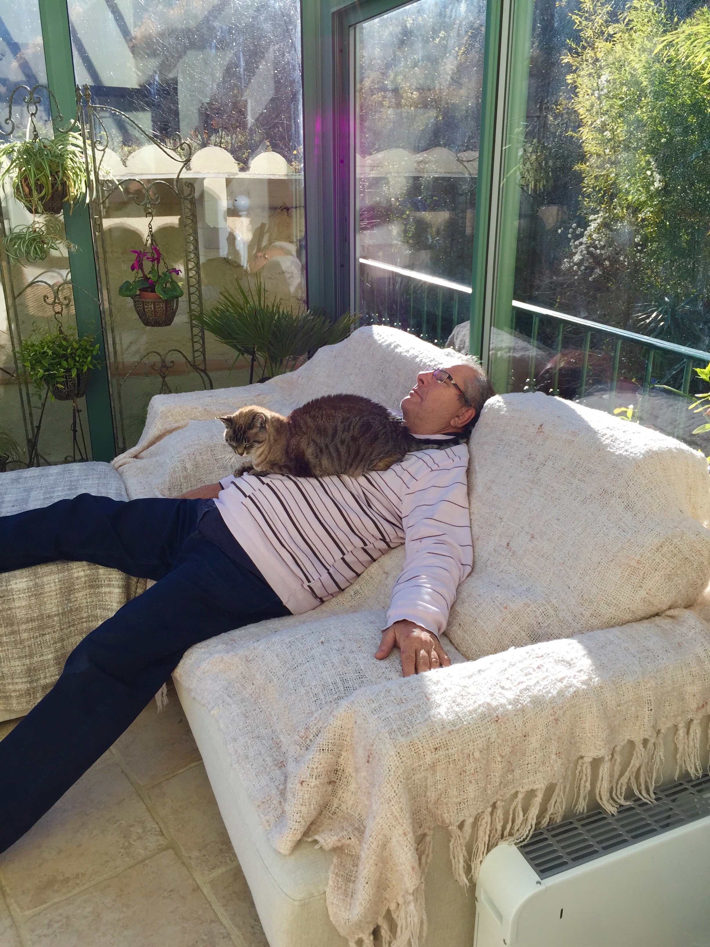 The cats were very pleased to see us, and after enjoying a red wine with his lunch, Mick needed a nap and took cat sitting to a whole new level.