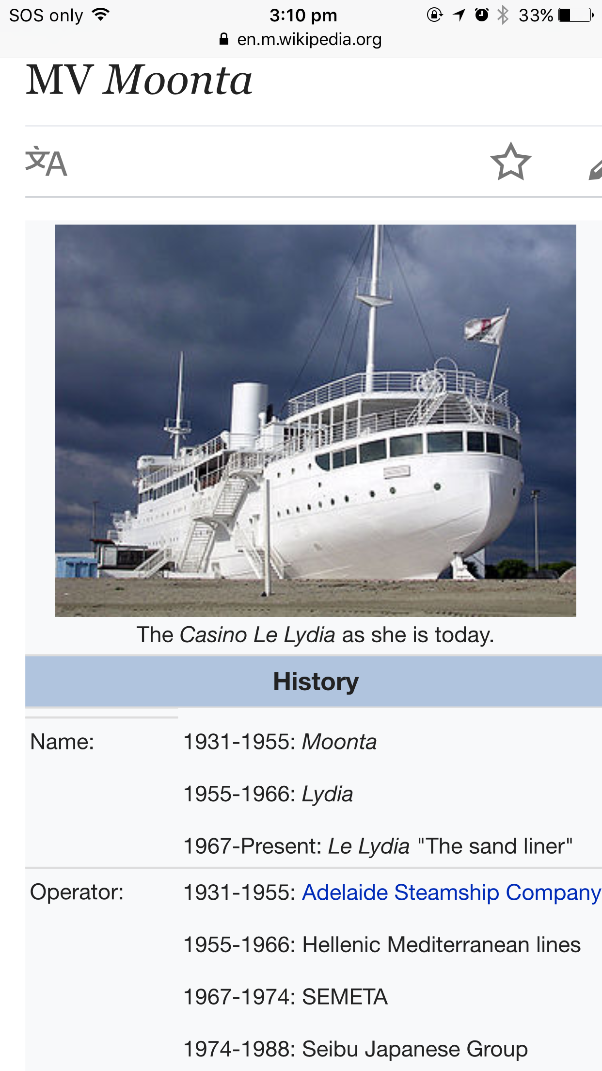 This ship was built in 1931 and used as an Australian coastal passenger ship. “Later in life she became the landlocked casino ship and tourist attraction Casino Le Lydia in Le Barcarès, France.”