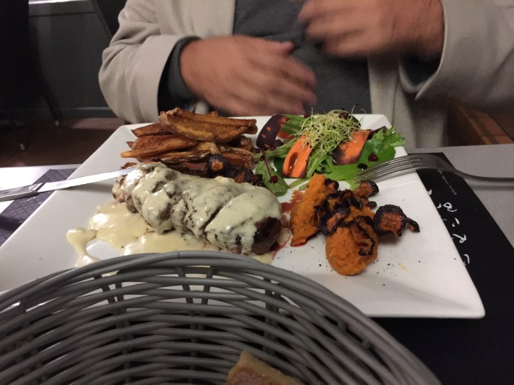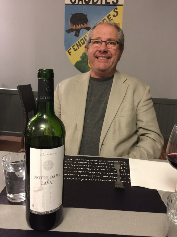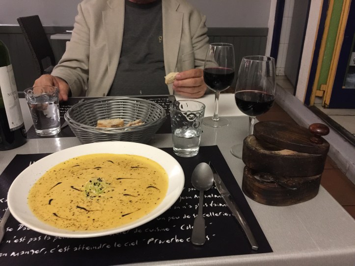 I chose the velouté and Mick the duck with Roquefort dressing. We selected a bottle of local wine named after the little church we first walked to down the gorge to see when we first arrived to house sit.