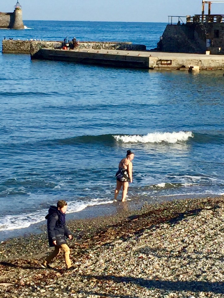 Even Mick didn’t wear shorts today, but this woman was bracing herself for a dip while the young boy was suitably rugged up against the cold.