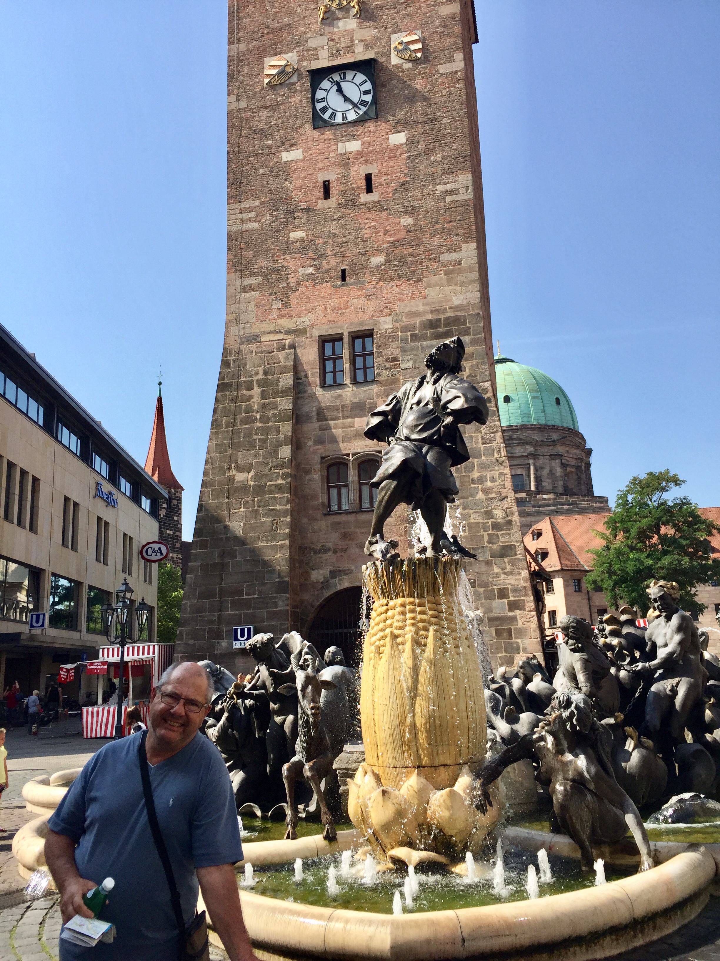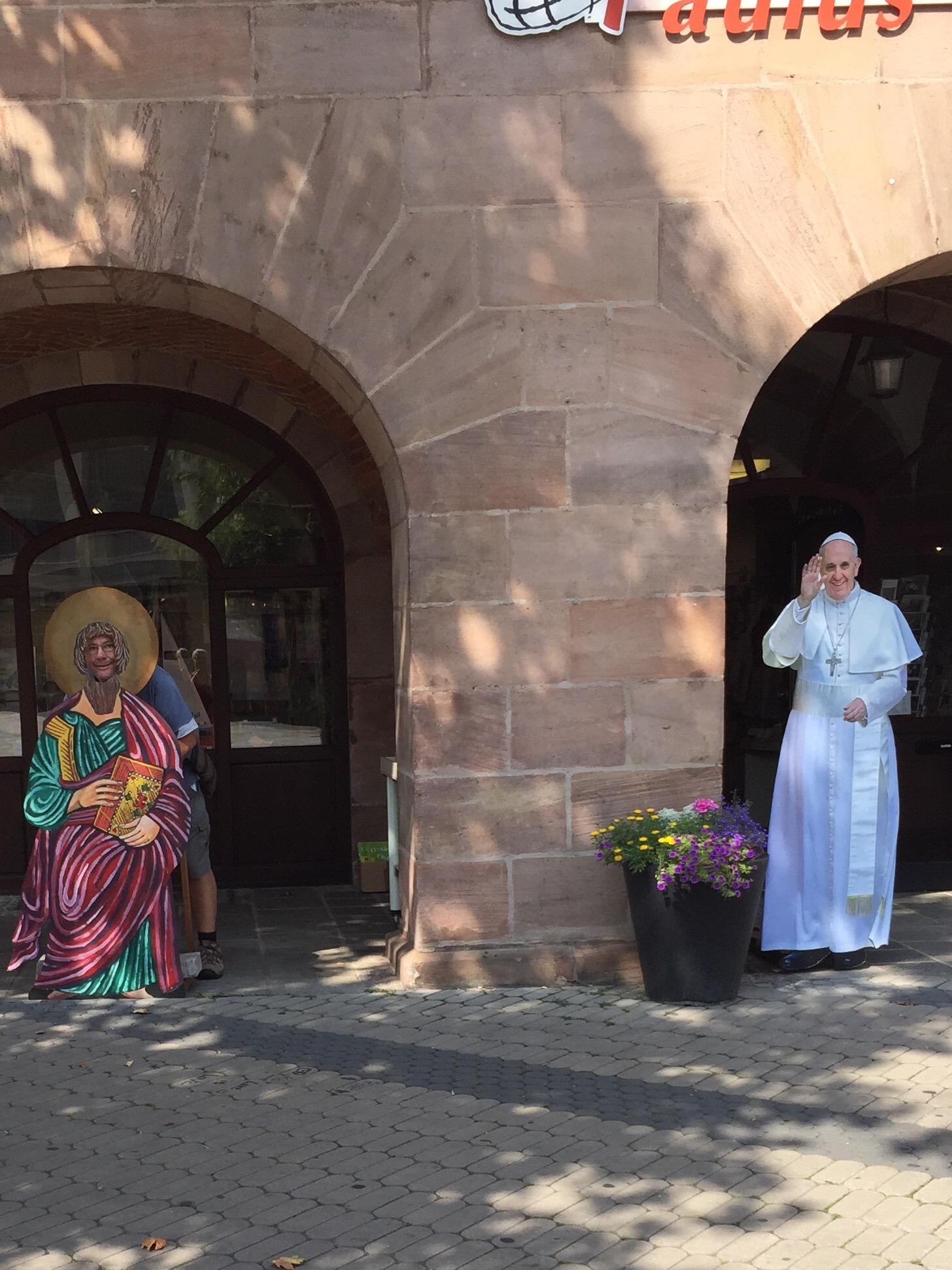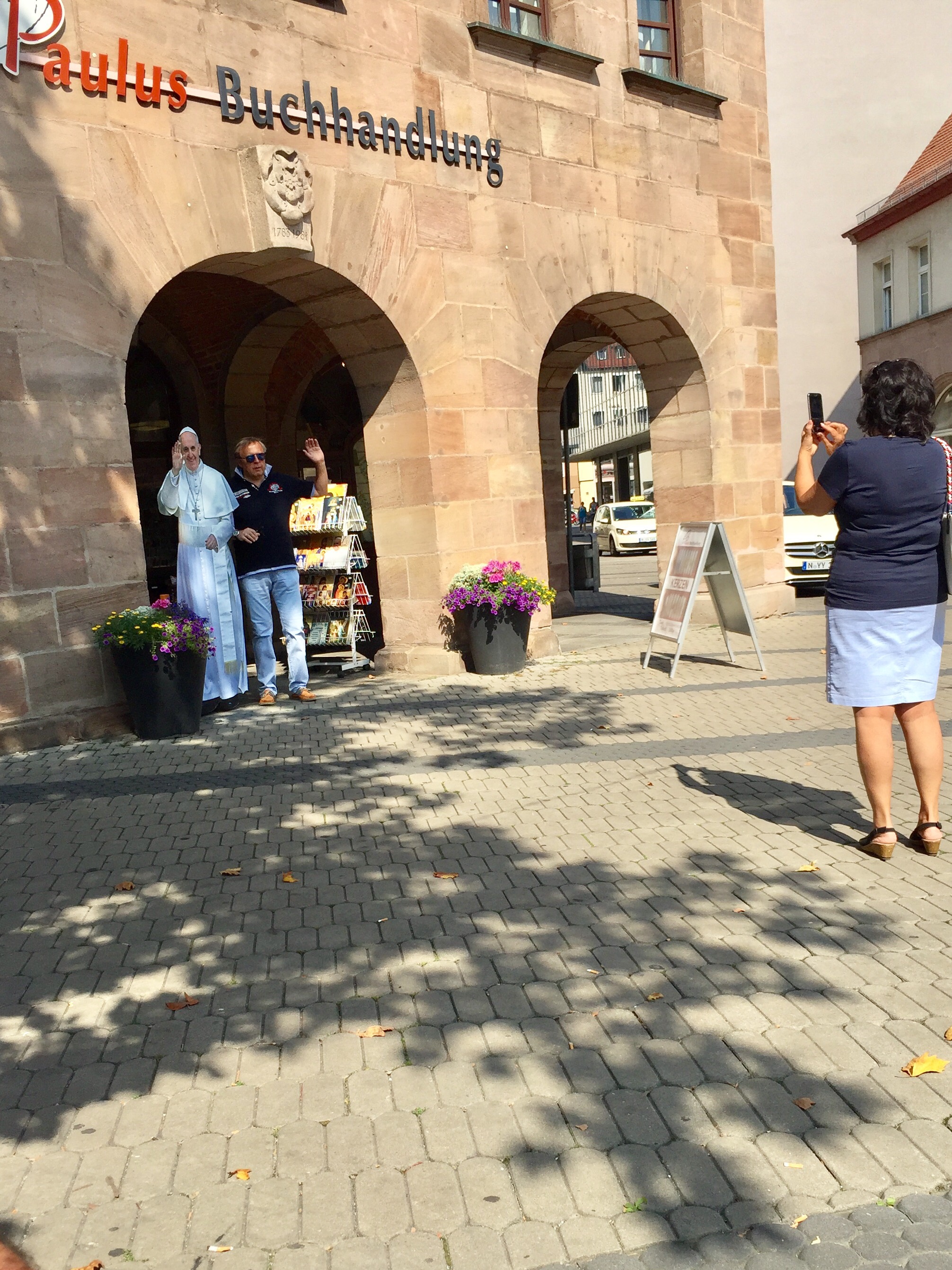 Next to St Sebald Church we noticed a Catholic bookshop where you could pose next to a life-size poster of Pope Francis. Can you spot Mick?