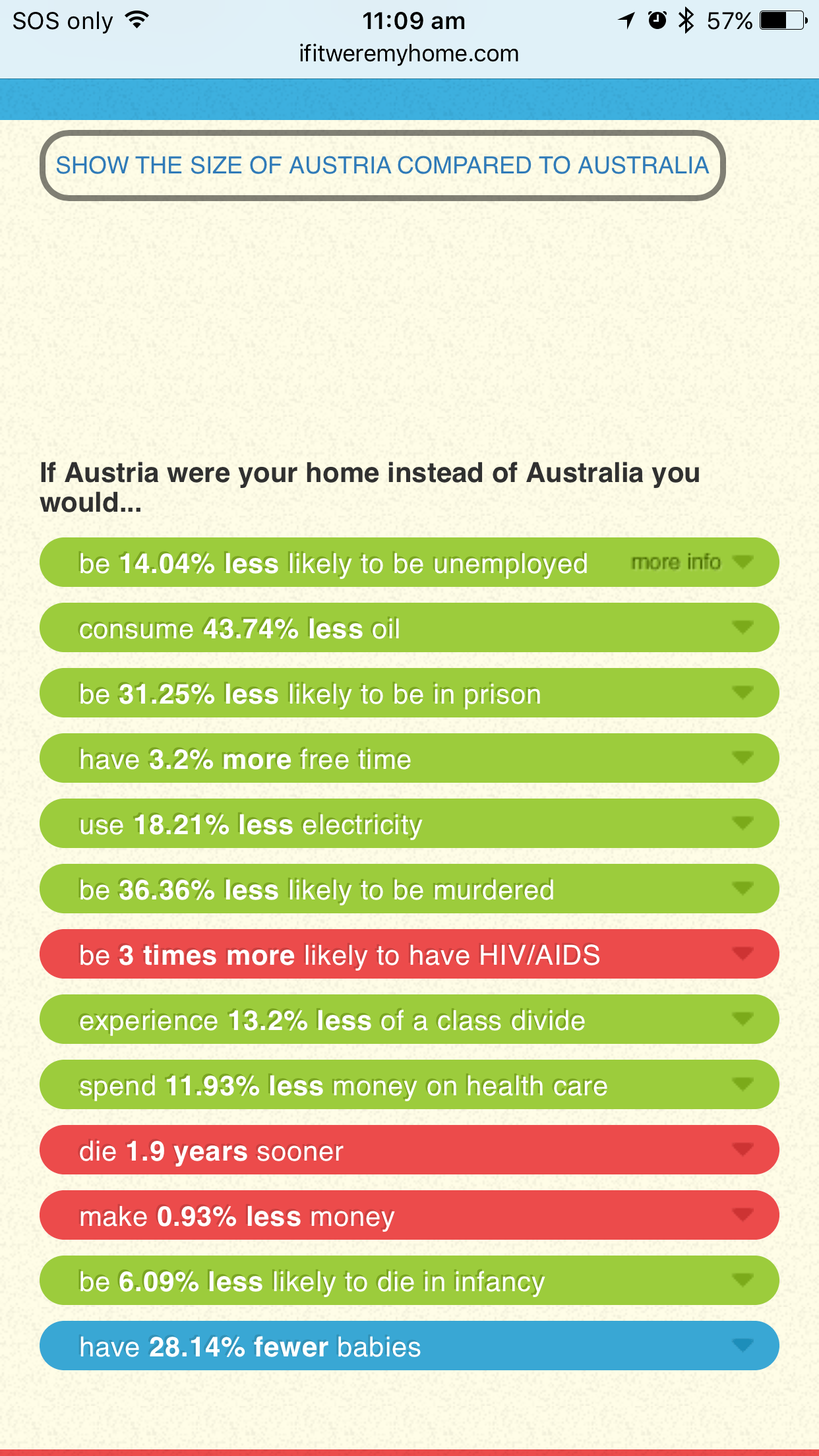 I found this interesting website that compares Austria to Australia. All the green lines means it is more favourable in Austria.