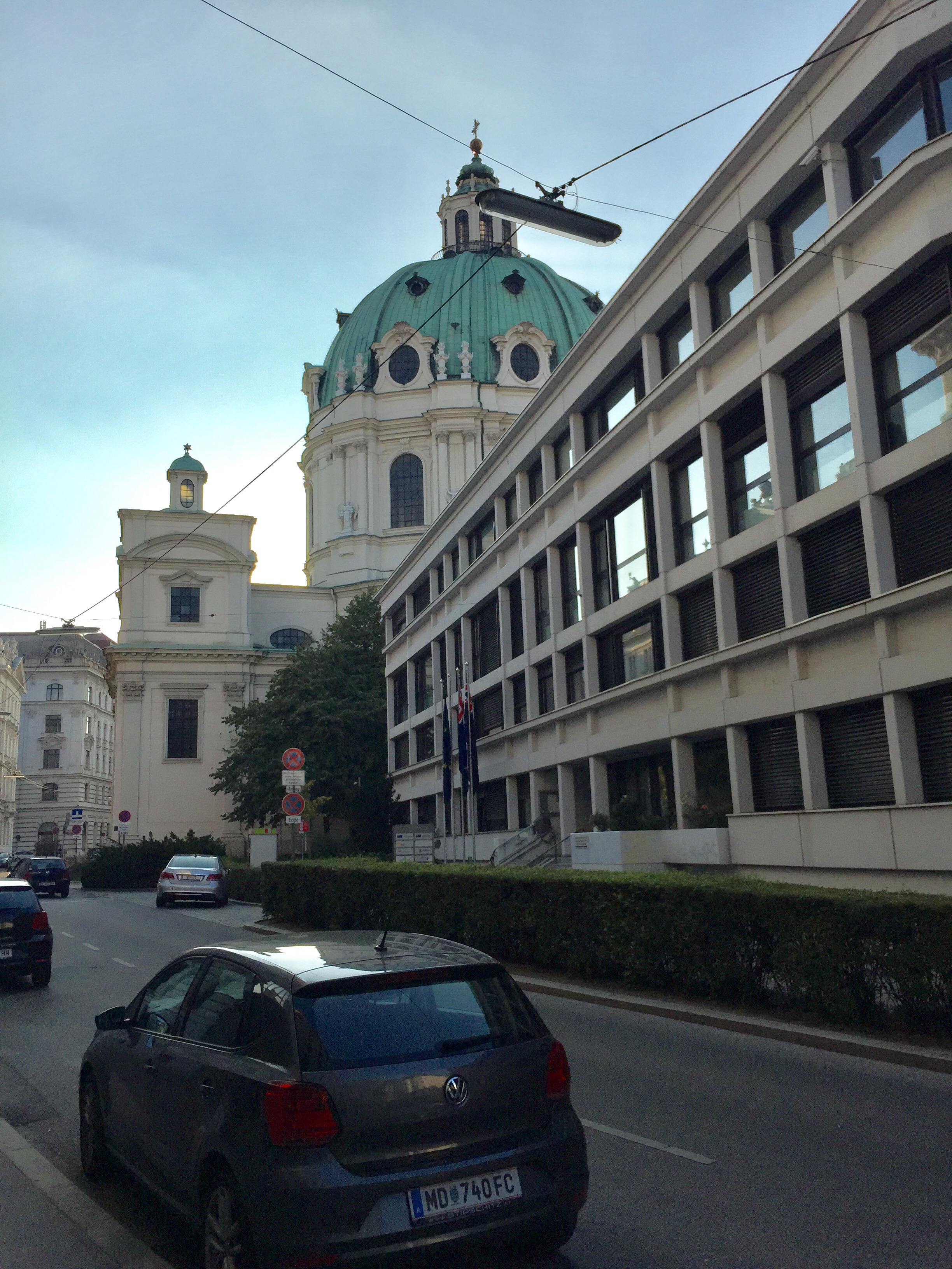 That is the Australian Embassy in front of St Charles Church on Karlsplatz.