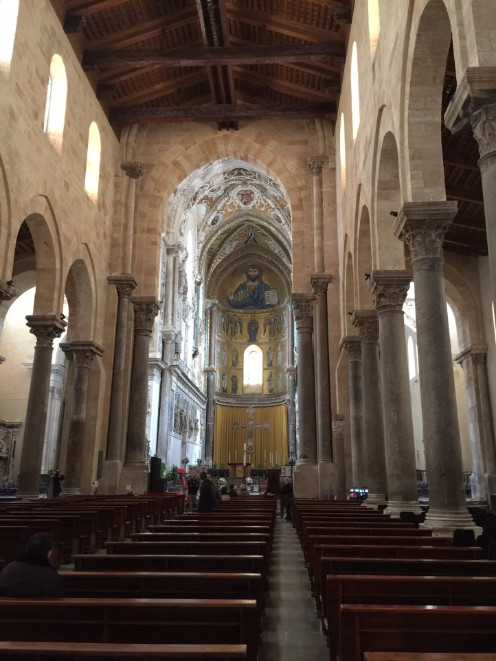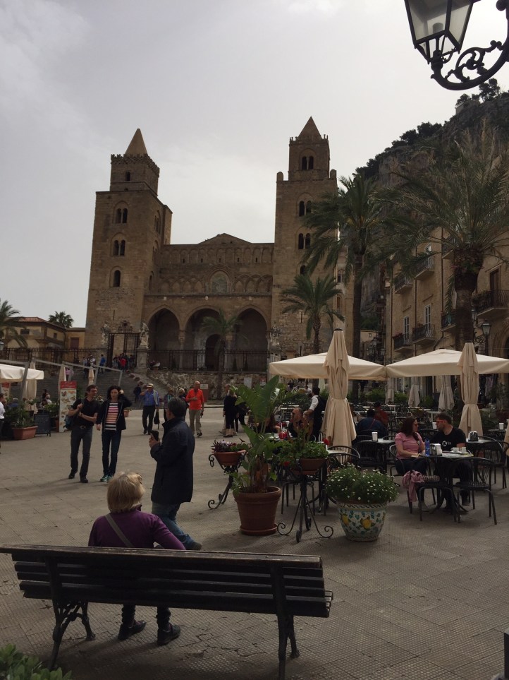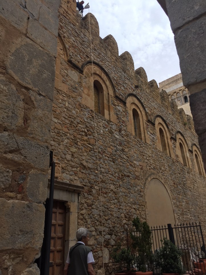 The 12th Century Romanesque Duomo is considered one of the finest in Sicily. So we went in for a look. Can you spot the man on the roof above Kath? He had a mate on the ground who was passing him up something.
