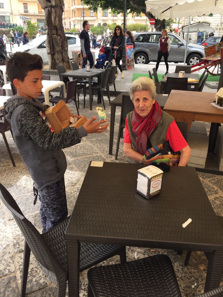While I was ordering us all a coffee, Kath was approached by a young boy with a budgie in a box. Kath gave him €1 but sadly did not get the lottery ticket he had promised.