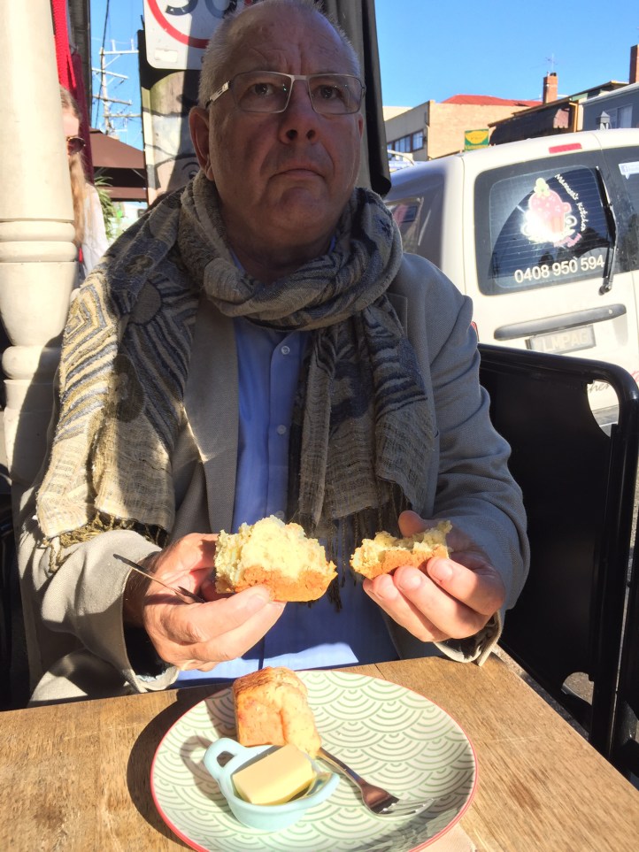 We arrived early and were able to spend a very pleasant hour in the township of Belgrave, where we enjoyed a great coffee each and Mick a huge scone. I even loaned Mick one of my scarves for the day, but he really didn’t need it.
