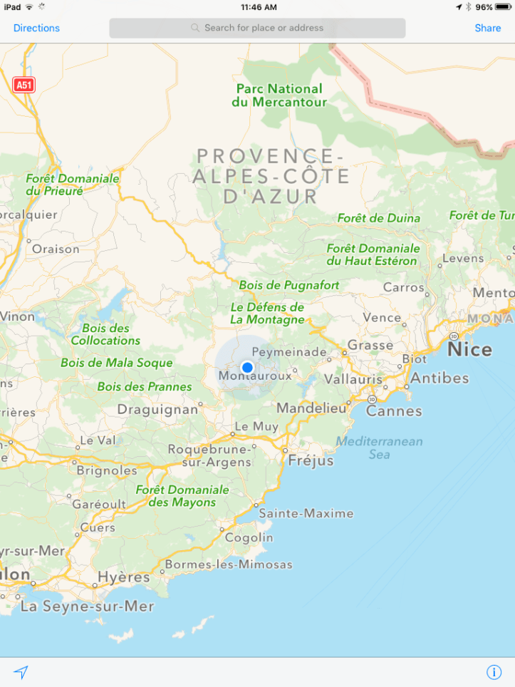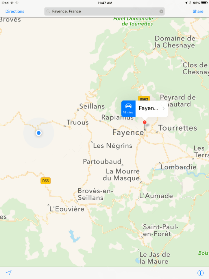 The small blue dot is the location of the house where we are staying, not too far from Antibes. Our goal is to travel to many of the smaller neighbouring villages, avoiding any major roads, during our three week stay.