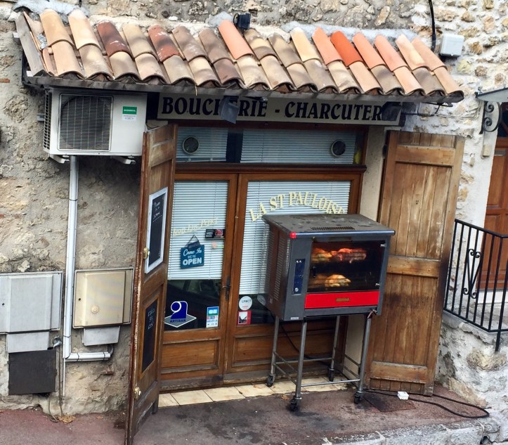 The Boucherie – Charcuterie was hoping people would be out later to buy the poulet rotis, possibly as a cure for the previous night. Rotisserie chicken is very popular in Provence, we had some with our host family for lunch on the day they departed on their holiday. They came with free chips / crisps. We were told it’s a Provencial thing.