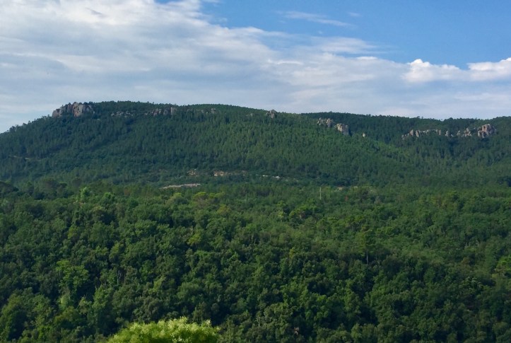 Notice all the green shaded area on the Google Maps screen shot? Well, here’s what it looked like up a bit closer. A very large (4300 hectares), dense forest of oaks and pines perched on the edges of the mountain range known as the Esterel Massif.