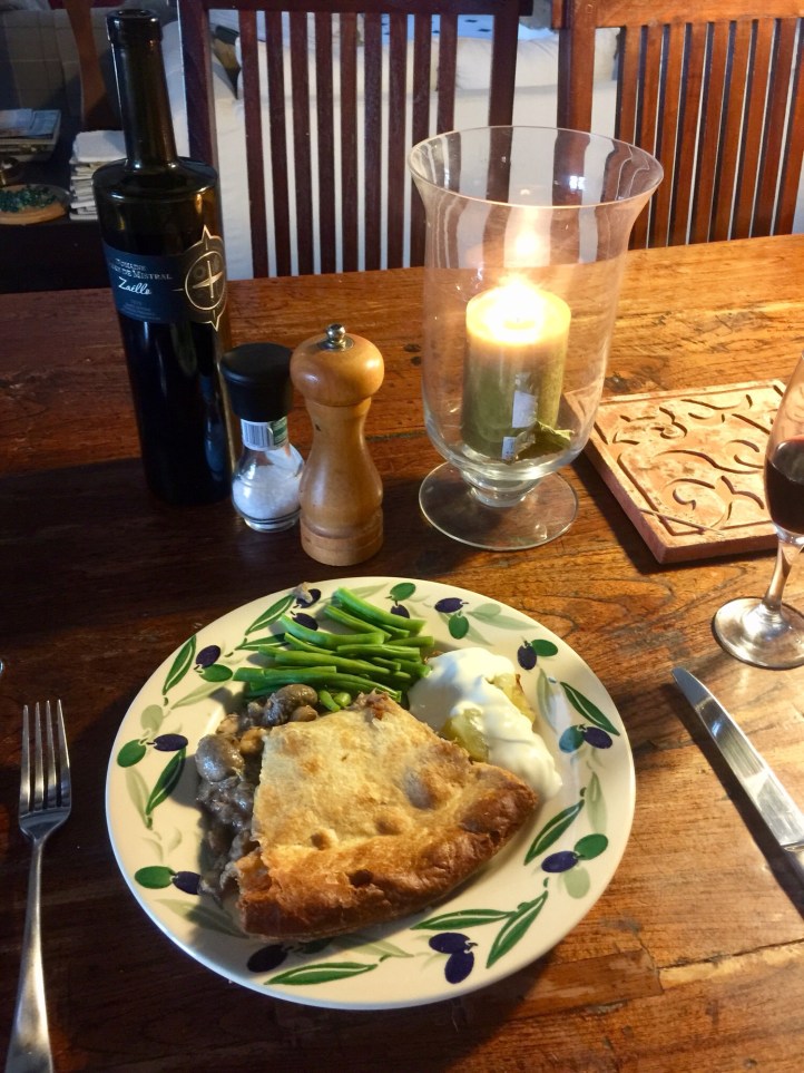 Dinner this evening was Mick’s homemade rabbit pie. He made the pastry case yesterday, using the fat from the duck breasts he’d cooked two days ago.