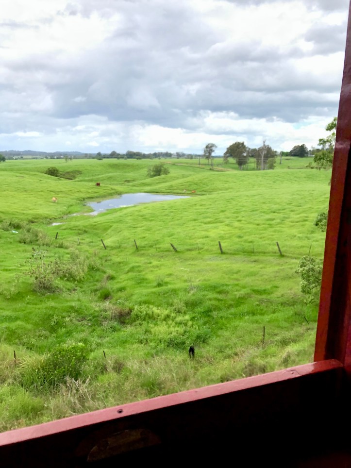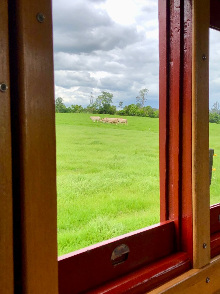 The trip back to Gympie was quicker – taking only 60 minutes, because it was mostly down hill. It was also less sooty as our carriage was further away from the engine. On the way up I wore my face mask and sun glasses, because it was hard to avoid the soot. I am hoping that part of the cost of our tickets was to offset some of the carbon we added to the atmosphere.