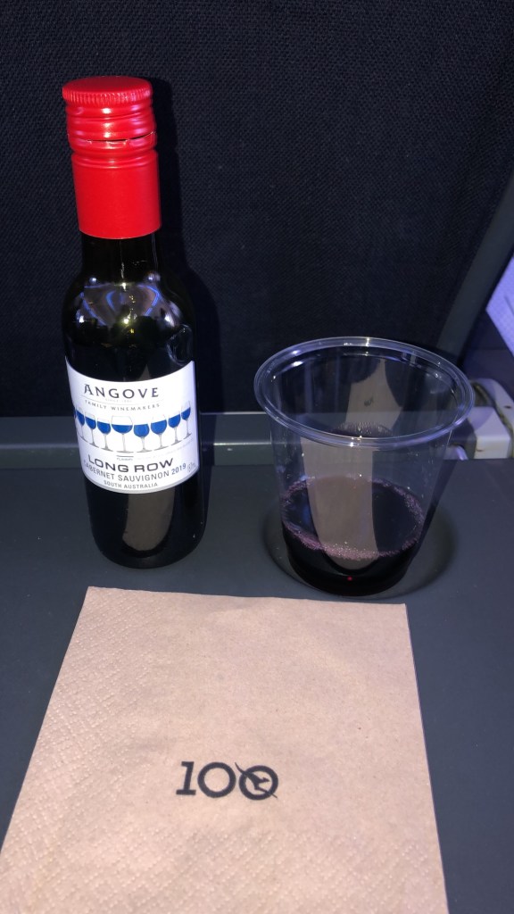 We enjoyed a very nice but simple meal – less fussy than before Covid. No bread rolls or desserts. We could enjoy our meal and drinks with our masks off, but once we were finished the masks had to be replaced. The Qantas staff was excellent. And the time went very quickly. We definitely felt like our holiday had started as we enjoyed a wine with our meal.
