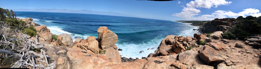 So, we drove to Wilyabrup Cliffs via Gracetown (where we saw surfers enjoying great waves and divers searching for abalone just inside the bay). It was about a kilometre walk from the car park to the cliffs where we could see northwards towards Injidup and south towards Gracetown.