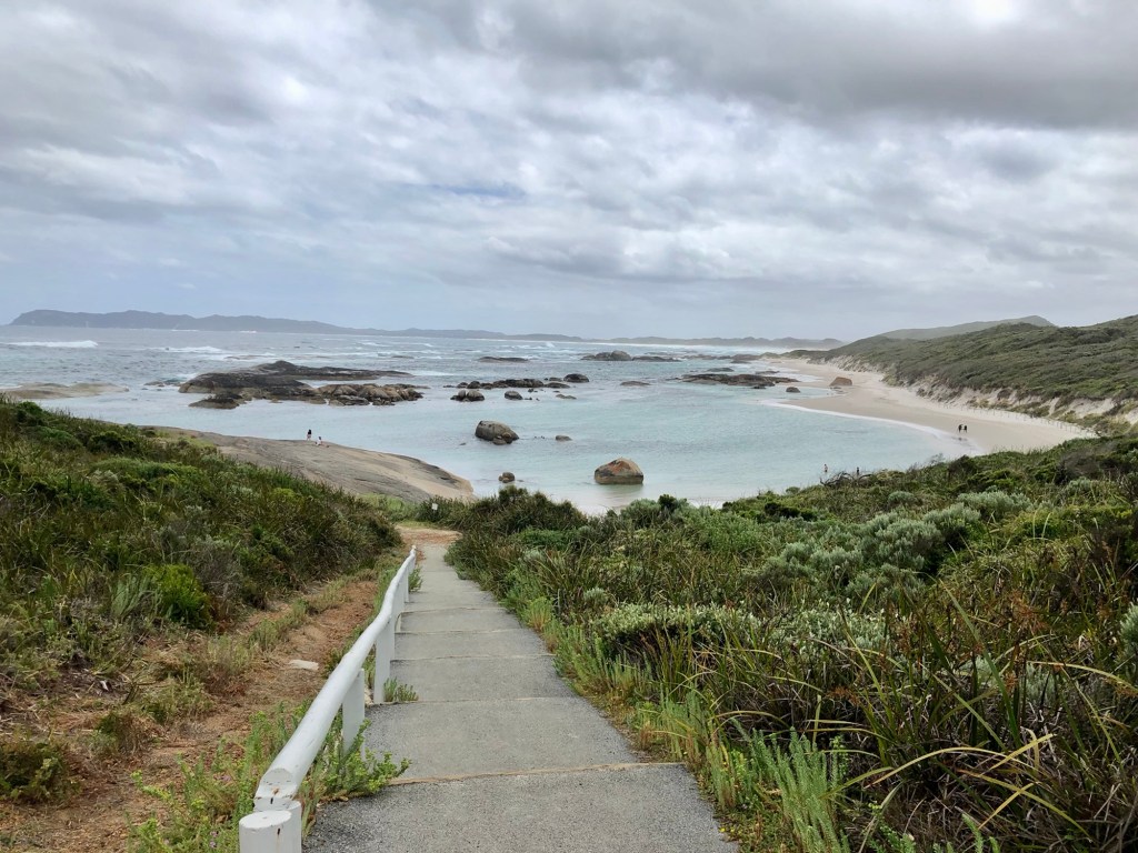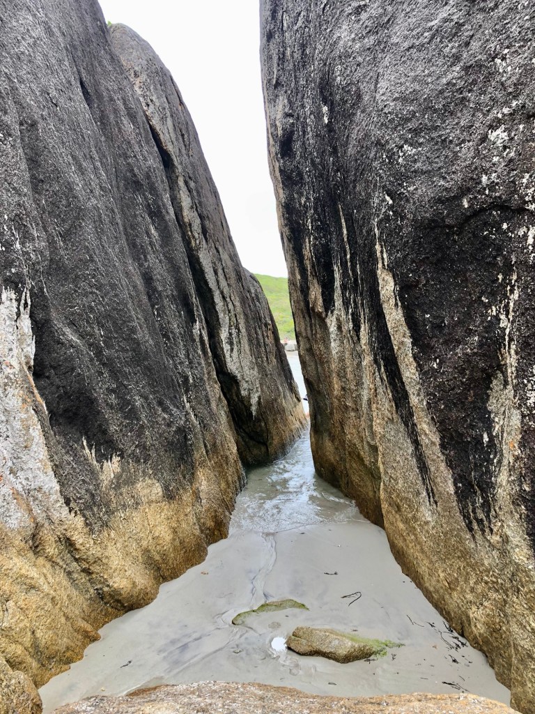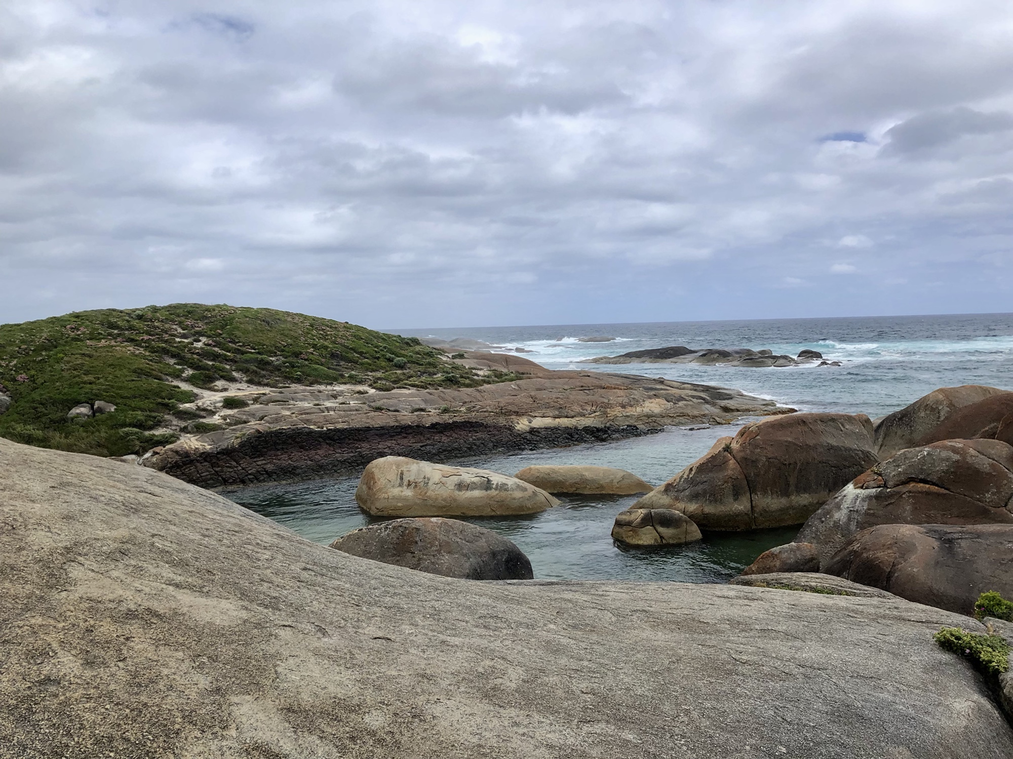 Greens Pool is a sandy white beach with boulders just outside of Denmark – it is a sheltered area in William Bay National Park. It was overcast today and the waters looked more grey than green.