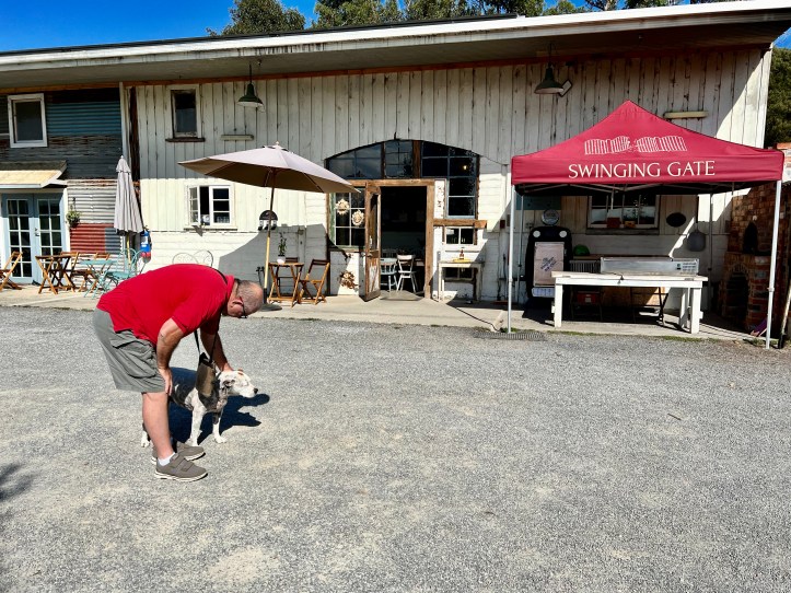 The first winery we visited was Swinging Gate Vineyard. Its cellar door and surrounding buildings are constructed of recycled materials. The vineyard owner’s dog and secret weapon, Nellie, came out to greet Mick. The owner was doing some running repairs to an ancient bus he uses during busy periods. We have certainly noticed that the smaller vineyard owners are required to be able to do just about any job on their wineries, including being very welcoming to customers like us.